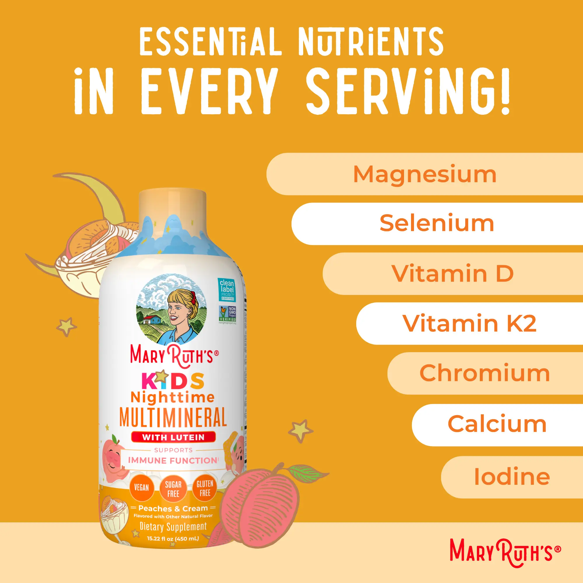 For Most Lifestyles: MaryRuth's Kids Nighttime Multimineral is Non-GMO Project Verified, BeVeg Certified, Vegan, Made in a GMP Facility. Dairy Free, Nut Free, Gluten Free, Sugar Free. Formulated For Kids! Clean Label Project Certified. B Corp Certified.