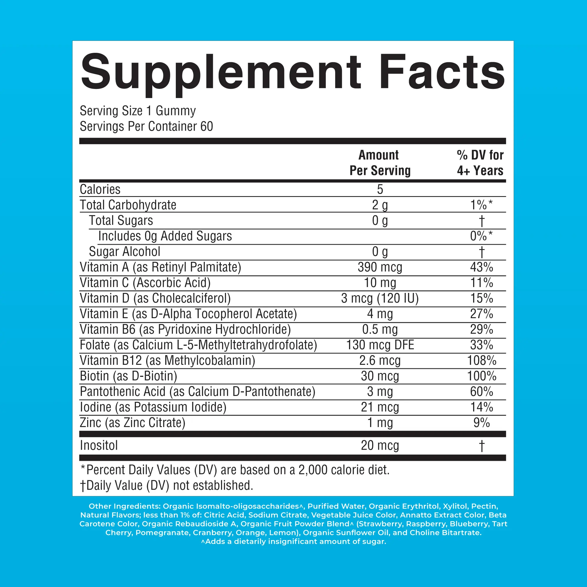 Suggested Use: Ages 4+ can take 1 gummy per day or as recommended by a physician or healthcare professional. If not chewed properly, this product is a potential choking hazard. Do not exceed the recommended dose