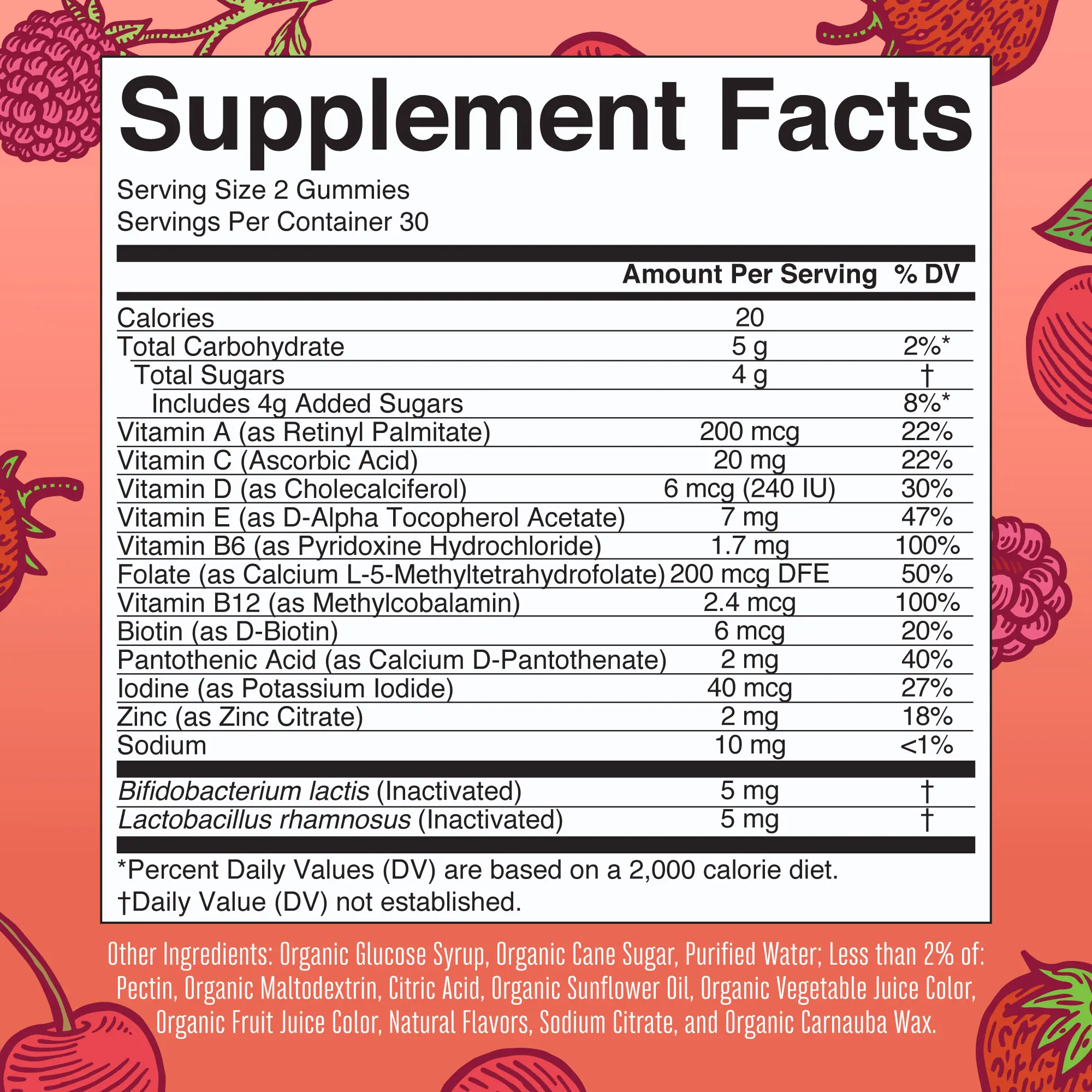 Important Nutrients + Postbiotic Gummies: With Vitamin A, C, and D3, a blend of B Vitamins, Iodine, and Zinc, plus Bifidobacterium lactis and Lactobacillus rhamnosus as postbiotics in mixed berry and cherry-flavored chewable gummies!