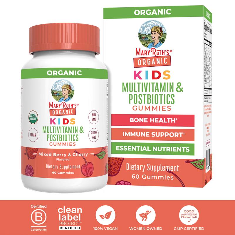 For Most Lifestyles: MaryRuth's Kids Multivitamin + Postbiotic Gummies are USDA Organic, Non-GMO, no gelatin, pectin based, vegan, made in a GMP facility. Dairy free, nut free, gluten free, formulated for kids! B Corp Certified.