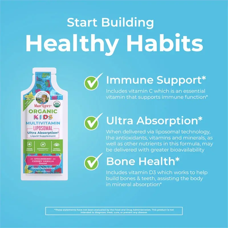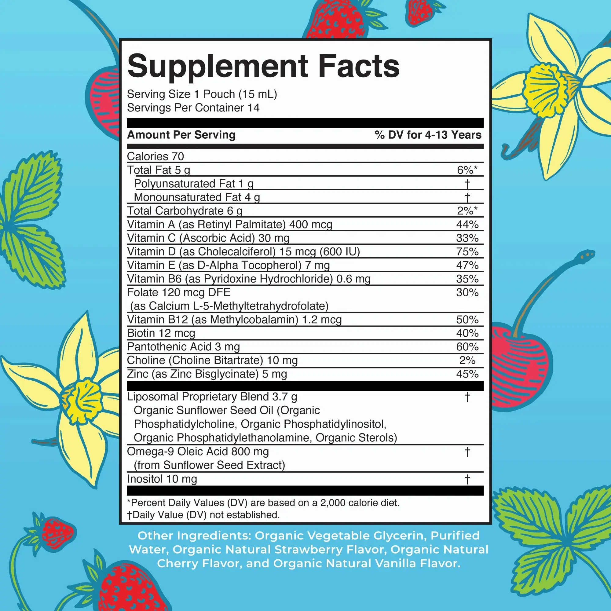 Kids Organic Multivitamin Liposomal: Looking to support nutrient gaps in your child’s diet? Our Kids Multivitamin Liposomal is an easy-to-take liquid here in convenient single-serving packets in a delicious strawberry cherry vanilla flavor that'll make kids enjoy taking their vitamins!
