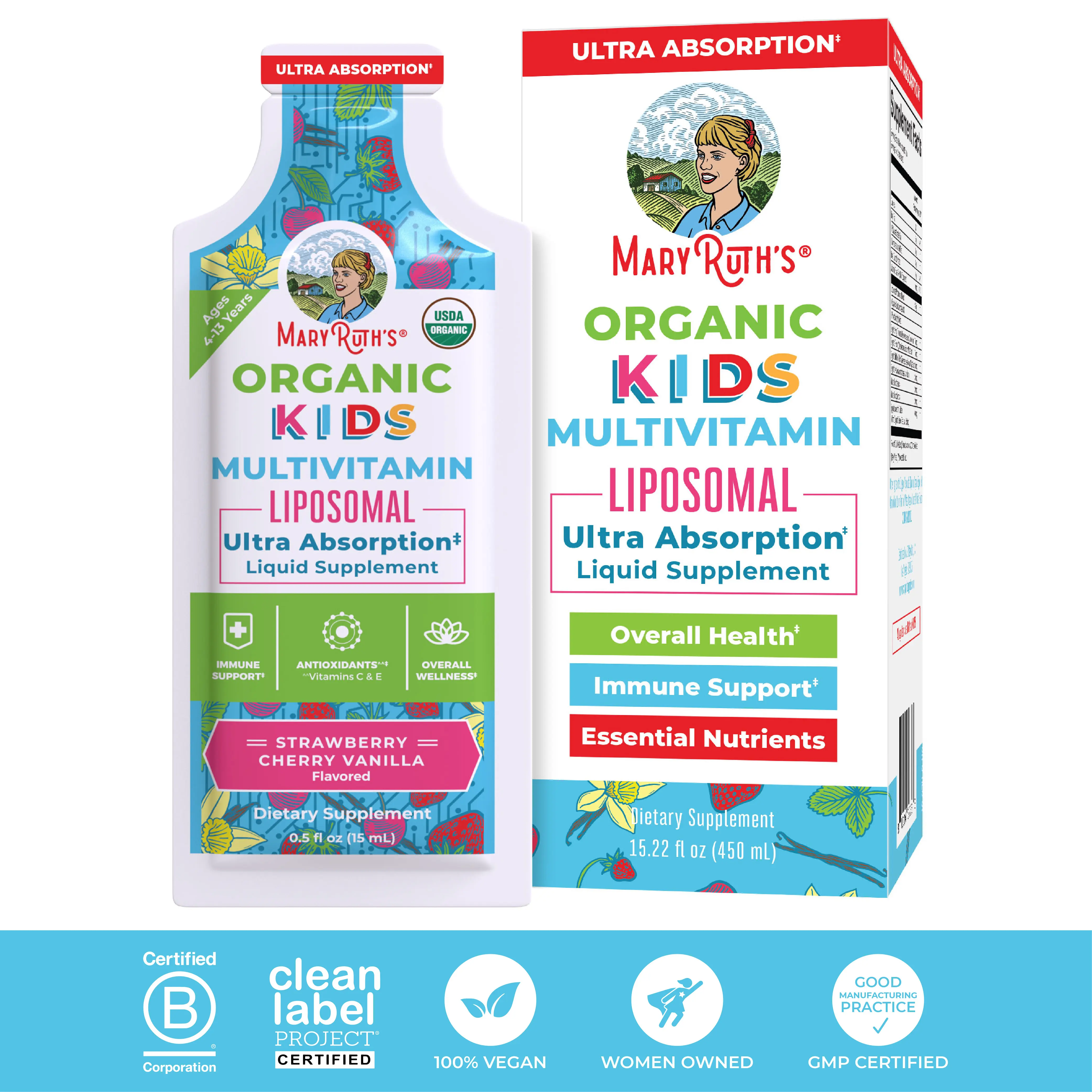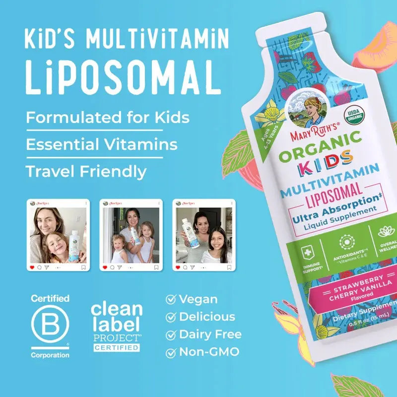 For Most Lifestyles: MaryRuth's Kids Multivitamin Liposomal is USDA Organic, Non-GMO, Vegan, Dairy Free, Gluten Free, Soy Free, Sugar Free**. No Artificial Colors, No MSG, Made in a GMP Facility. This product CONTAINS nut allergens: Coconut-derived glycerin. Clean Label Project Certified. B Corp Certified.