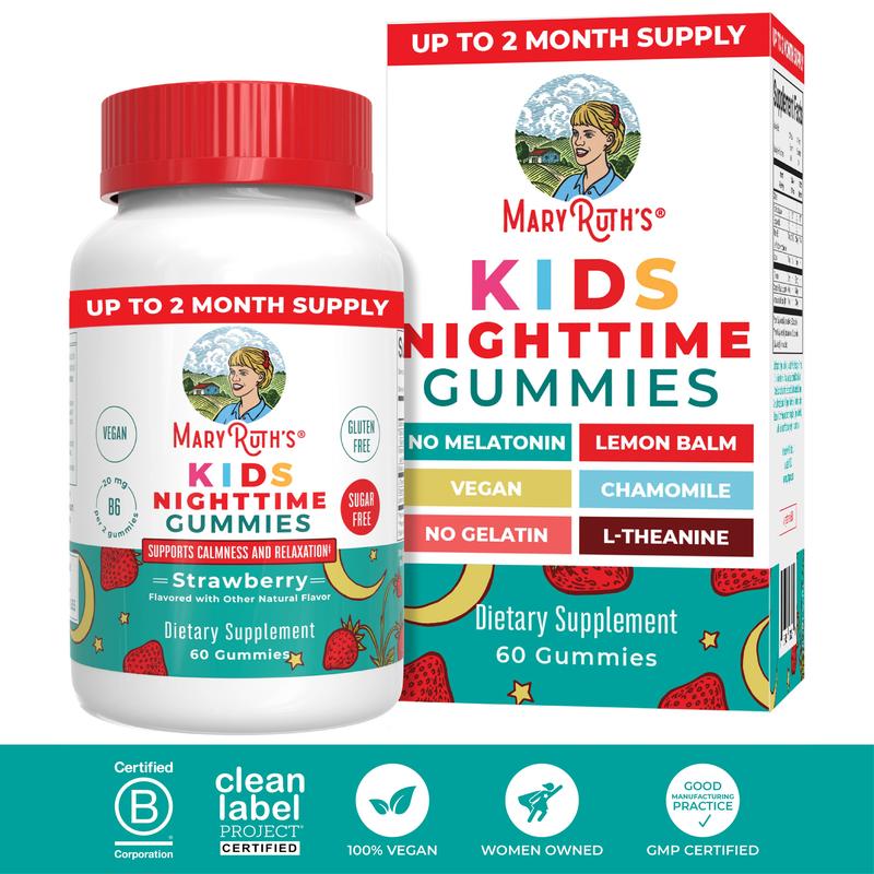 For Most Lifestyles: MaryRuth's Nighttime Gummies for Kids are Non-GMO, No Gelatin, Pectin Based, Vegan, Made in a GMP (Good Manufacturing Practice) Facility. Dairy Free, Nut Free, Gluten Free, Soy Free, Sugar Free. Clean Label Project Certified. B Corp Certified.