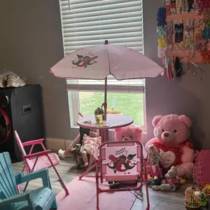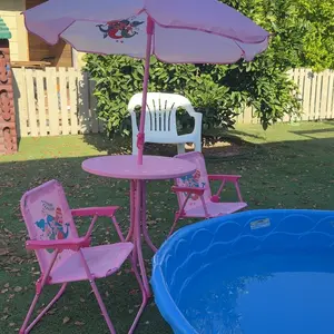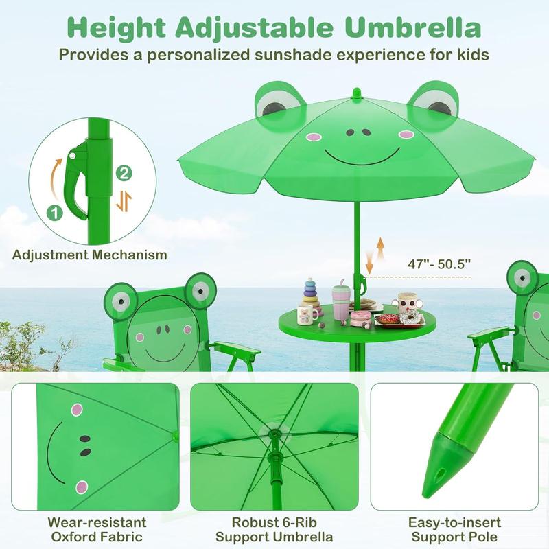 Sturdy metal frame ensures sturdiness and stability, while the chairs with backrests and armrests provide a comfortable seating experience. The height adjustable umbrella provides a personalized sunshade experience for kids.