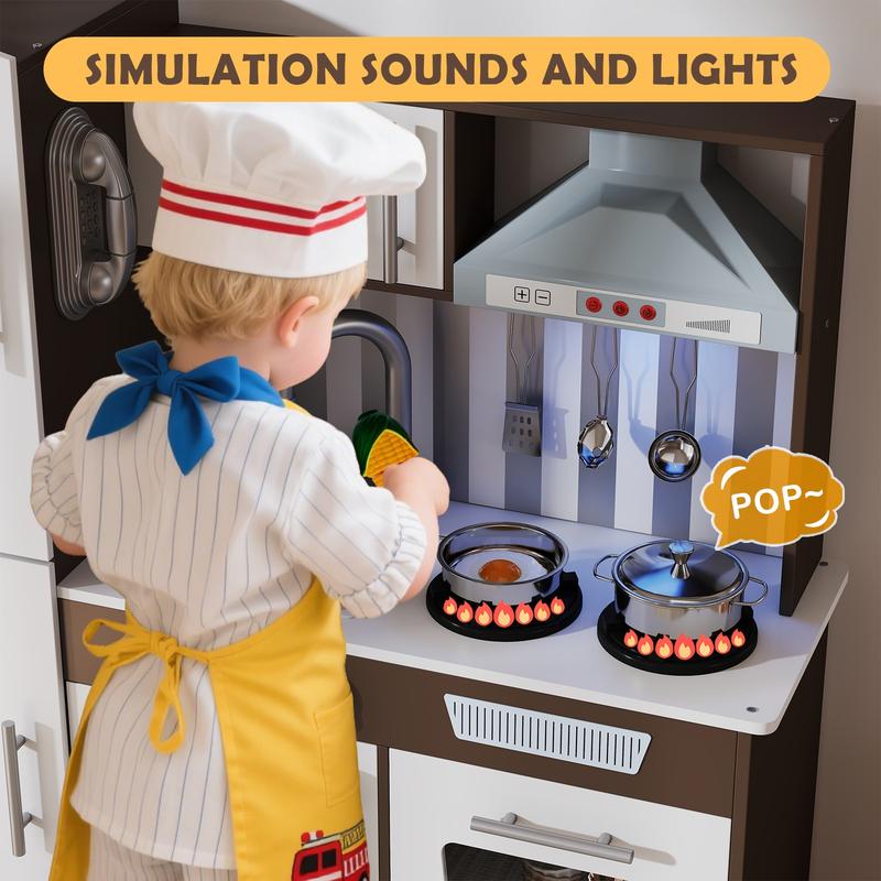✨ Perfect for Little Chefs! This Pretend Wooden Kid Kitchen Playset is ideal for kids ages 3+. It includes an oven, ice maker, blackboard, and a toy storage box. The set is designed with sound and light features, making playtime more engaging. 🌟