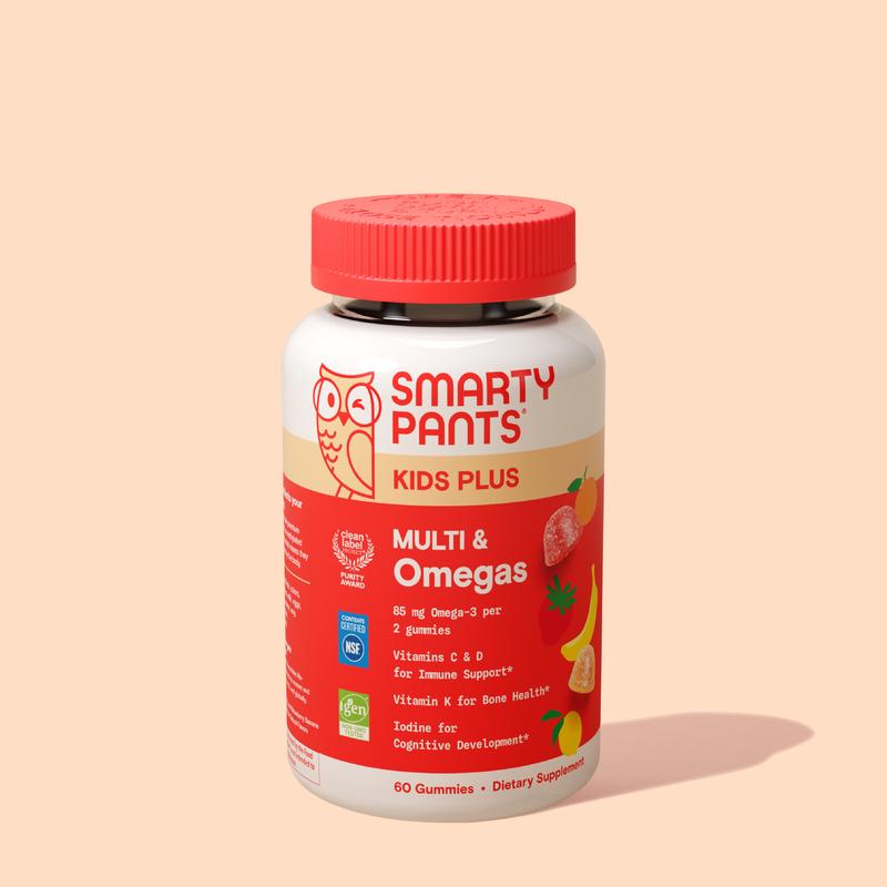 SMARTY PANTS Kids Plus Multi & Omegas is a multivitamin specifically formulated to support kids' growth and development. It contains 16 daily nutrients, including vitamins C, D3, B12, A, K1, and folate. Also includes Omega-3 DHA & EPA.