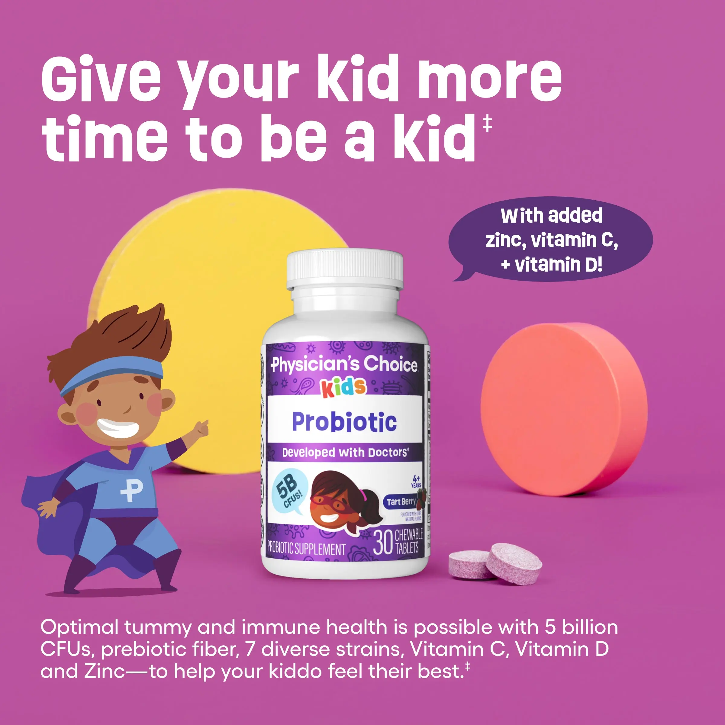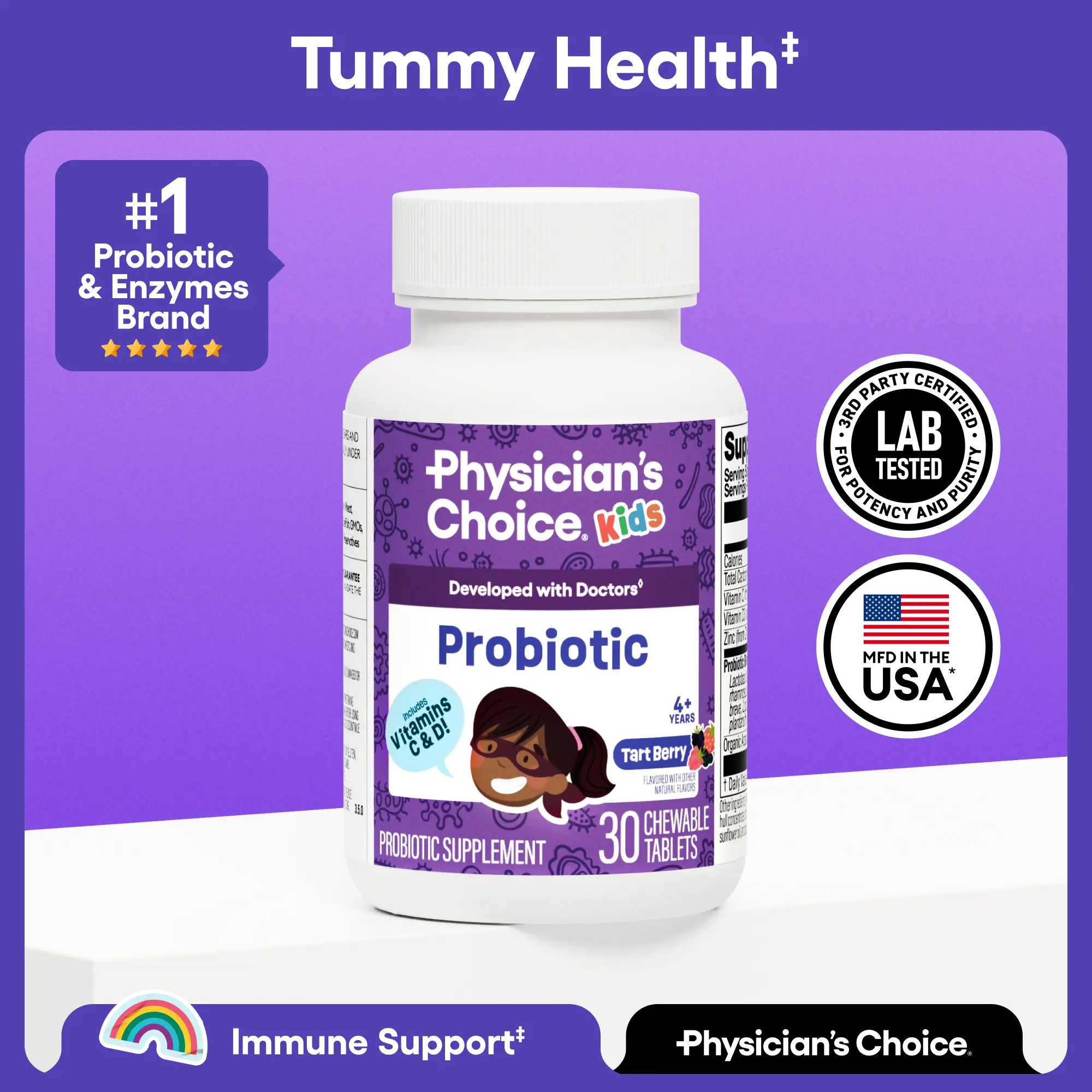 Product Use: Chew 1 tablet daily, under adult supervision to support digestive health and immune function.
