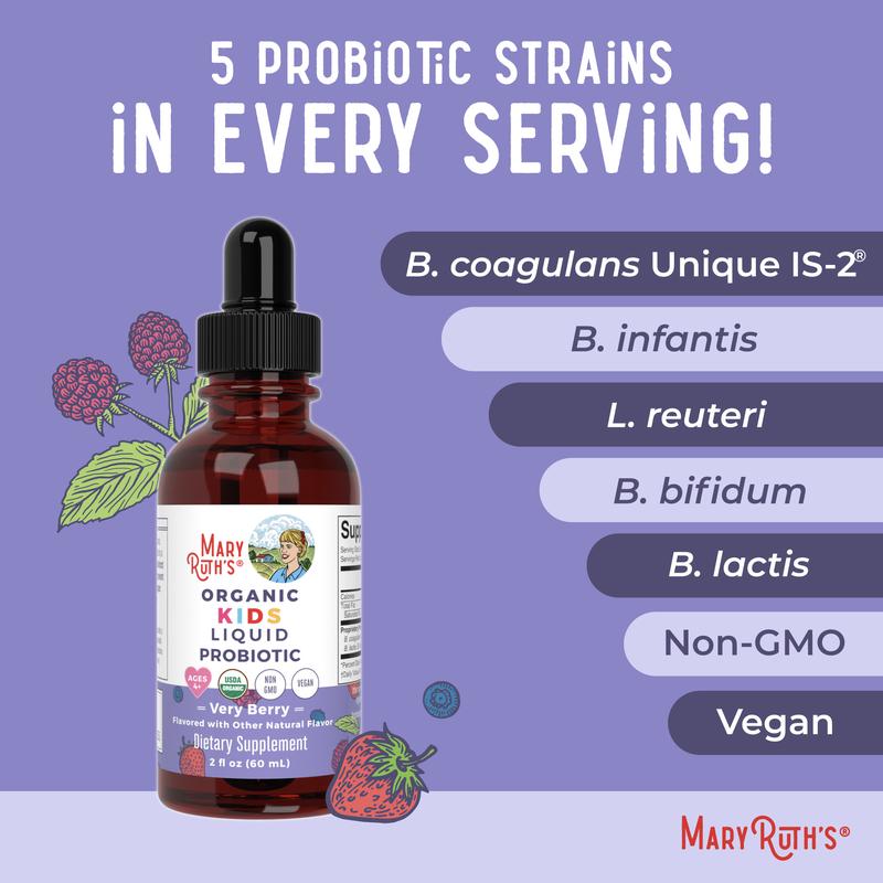 Liquid Kids Probiotic: This USDA organic probiotic contains a proprietary blend of five strains: Bacillus coagulans Unique IS-2, Bifidobacterium lactis, Bifidobacterium infantis, Bifidobacterium bifidum, and Lactobacillus reuteri.