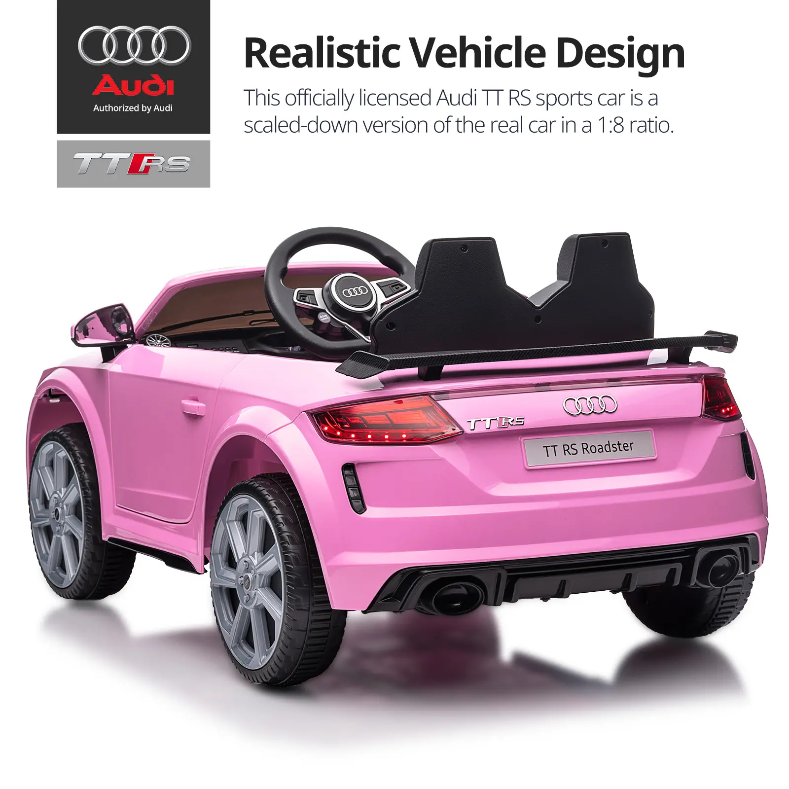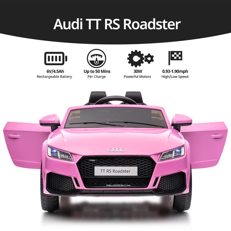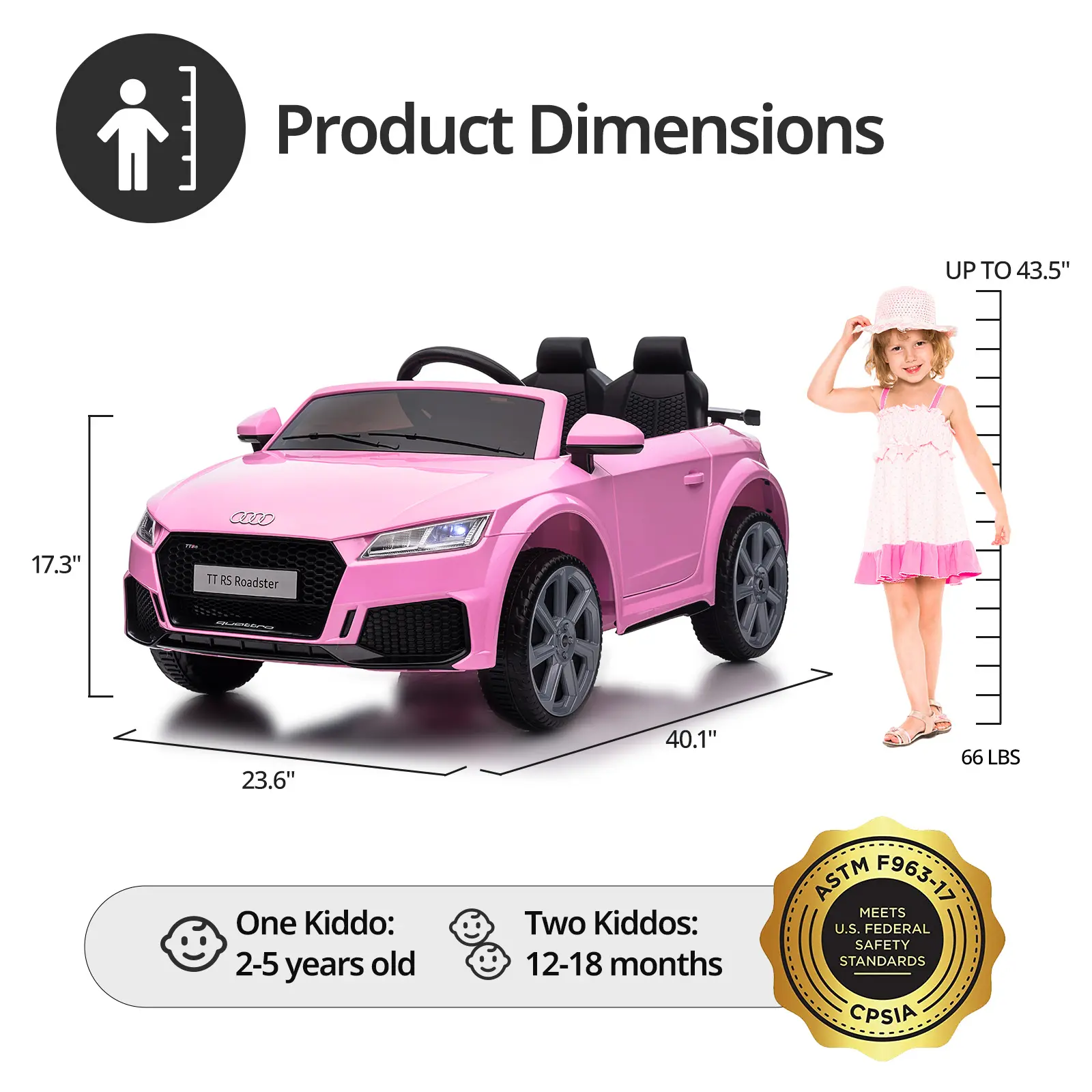 The Hikiddo kids ride on toy is designed by Licensed Audi TT RS in a 1:8 ratio that will bring endless joy to your kiddos. Our electric car for kids have forward and back mods of low or fast speed, children will get real driving through the pedal and steering wheel, and the operation is very easy for boys and girls. Of course, parents can control the riding toys through the remote and participate in the fun with their little ones. The 6V ride on toys feature abundant configuration, with built-in music, USB port, front and rear headlights, and shock absorbers, these will not only make kids' riding more funny but also ensure safer driving. The ride on cars with remote control will be perfect gifts, kids will definitely fondle admiringly!