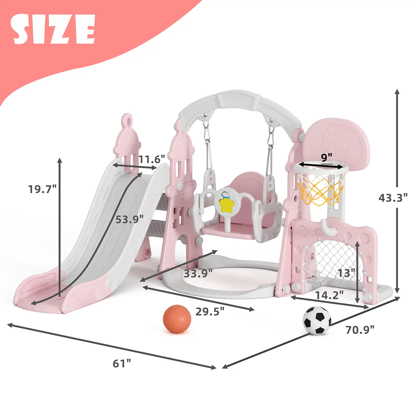 ·4-in-1 Fun for Active Kids: This versatile playset is packed with exciting features to keep kids entertained for hours. Zoom down the smooth slide, swing through the air, play basketball with the basketball hoop, and climb the sturdy ladder. With its compact design and easy assembly, this playset is perfect for backyard adventures or indoor playtime.