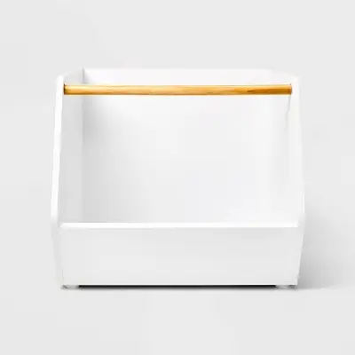 Add extra storage for toys, books and more in your child's room with this Stackable Laminate Storage Bin from Pillowfort. This storage bin for kids features an open front with a wooden rod to keep items in place and easily accessible. The solid laminated finish coordinates well with a wide variety of decor, and the stackable design allows you to stack similar bins atop one another to save space.