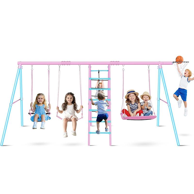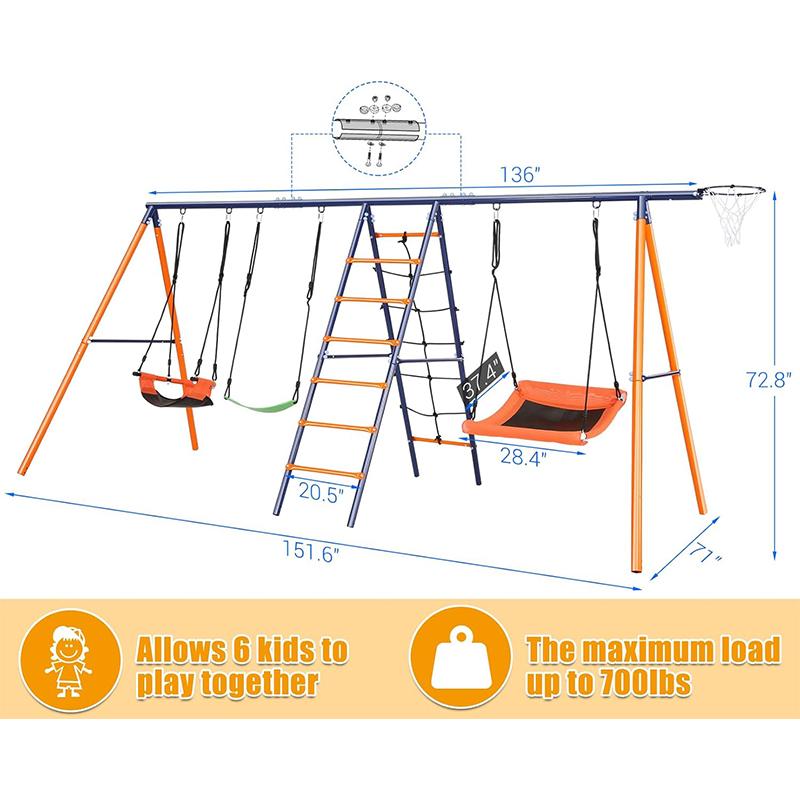 ·Complete Outdoor Playground - 3 adjustable swings + climbing ladder + net + basketball hoop. 700lb capacity for whole family enjoyment.