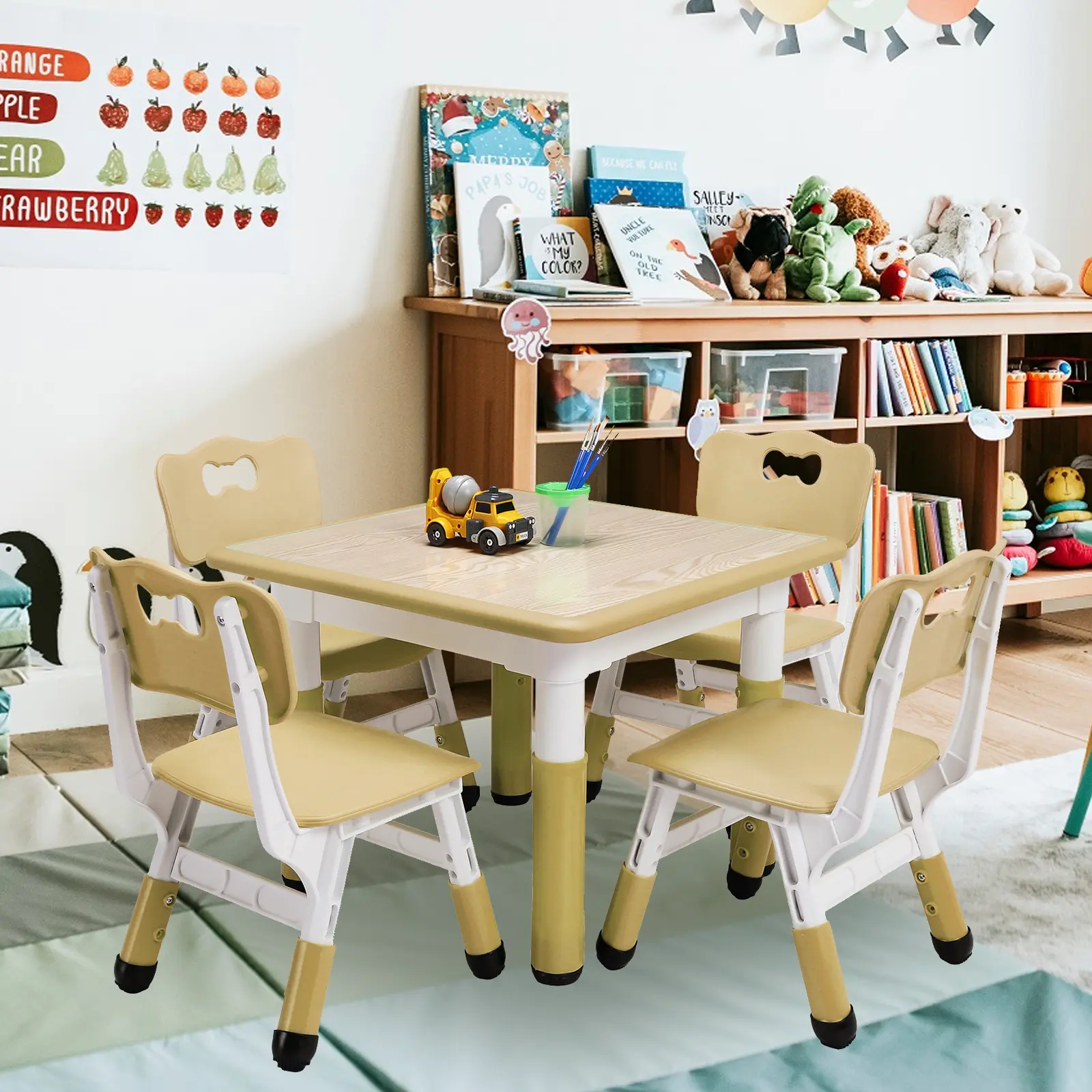 ·5.【Awesome table and chairs】: This table and chair set is a perfect fit for kids' playrooms, homes, school rooms, and daycare centers. Designed for toddlers and kids between the ages of 2-10, it provides a versatile space for activities such as studying, playing, and daycare use