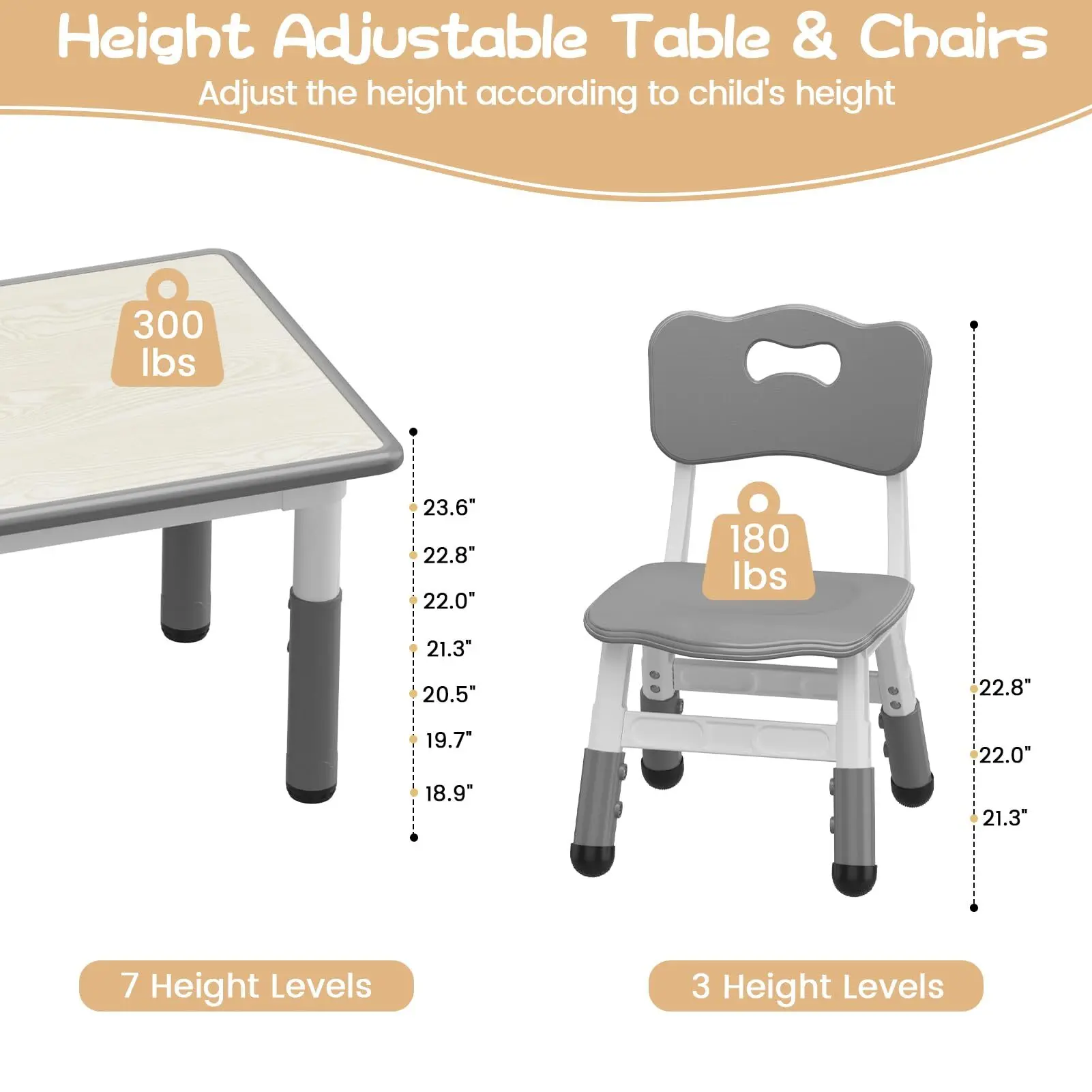 Our kids table and chairs are both height-adjustable, suitable for kids from 3-8 years old. The table has 7 height levels: 18.9"-23.6" (48-60cm) and can hold up to 300 lbs. The chairs has 3 height levels: 10.6" (26cm), 11.4" (28cm), 12.2" (30cm), and has a maximum load capacity of 180 lbs. The toddler table and chairs set will accompany your baby to grow up!