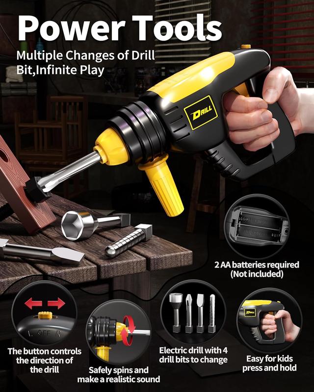 ·The toy drill comes with 4 interchangeable drill bits for various functions.