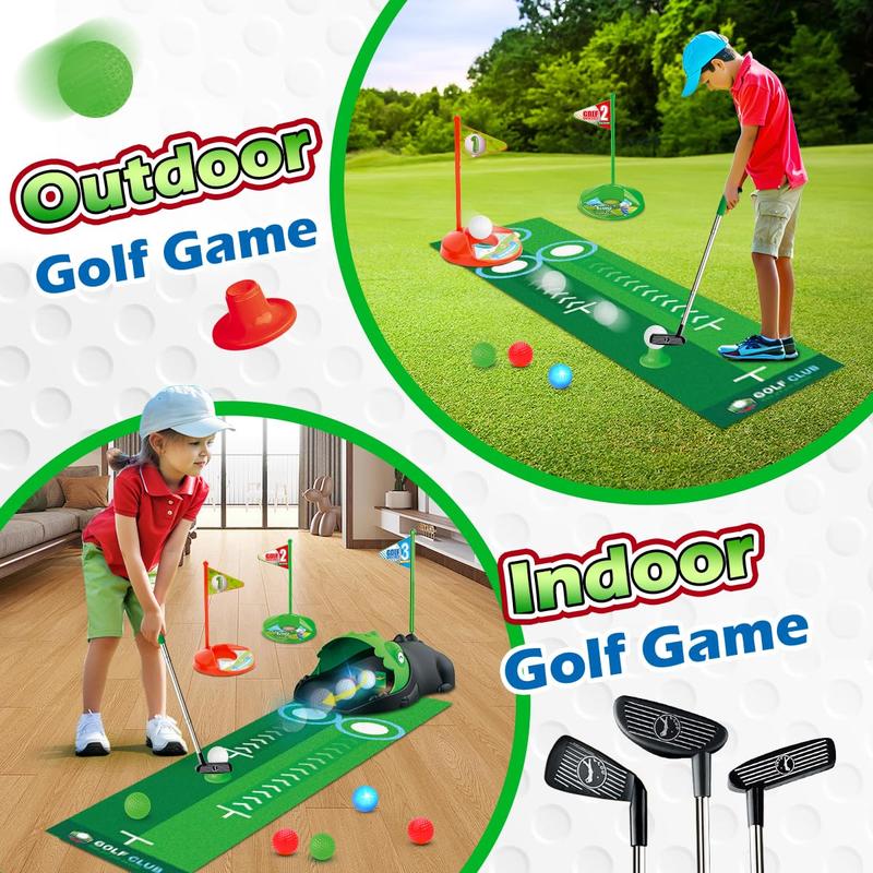 This 16PCS kids golf set includes everything to start learning: auto ball returner, putting mat, 3 adjustable clubs, 2 LED balls, 2 green balls, 2 black balls, tees, targets, and a sticker. Easy setup for instant fun!