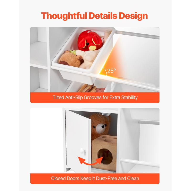 • Open Storage Bins: With 8 open bins on slanted, non-slip tracks, kids can easily spot their favorite toys – no need to dig through closed boxes. The bins stay in place, and it also teaches little ones how to sort and organize, helping them develop good habits