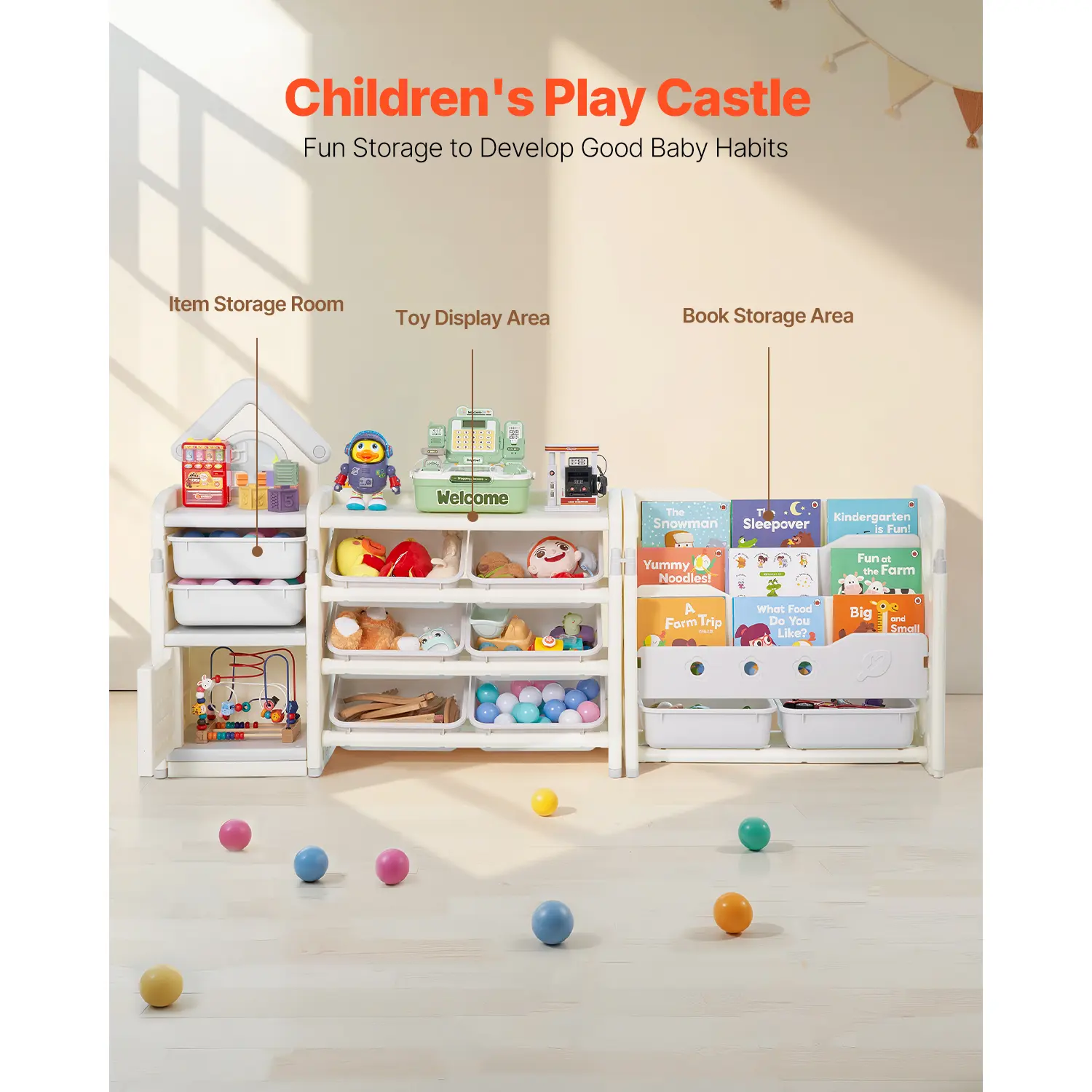 • Multi-Functional Storage: This kids toy organizer combines a toy display area, book storage section, and storage room, providing plenty of space for various toys, books, stationery, blocks, and more. It keeps the room tidy with a large-capacity, divided design, while letting kids experience the fun of organizing their own things