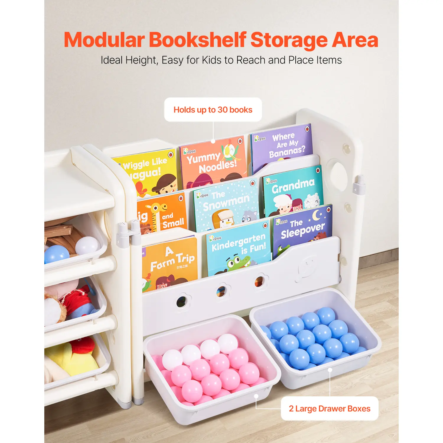 • Open Play Area: The open storage bins rest in slanted, non-slip grooves, making it easy for kids to see their favorite toys, while ensuring the bins stay securely in place. The open bookshelf holds up to 30 books, and the adjustable height allows children to access them independently. This setup is ideal for teaching kids how to categorize and organize their toys and books, fostering good habits