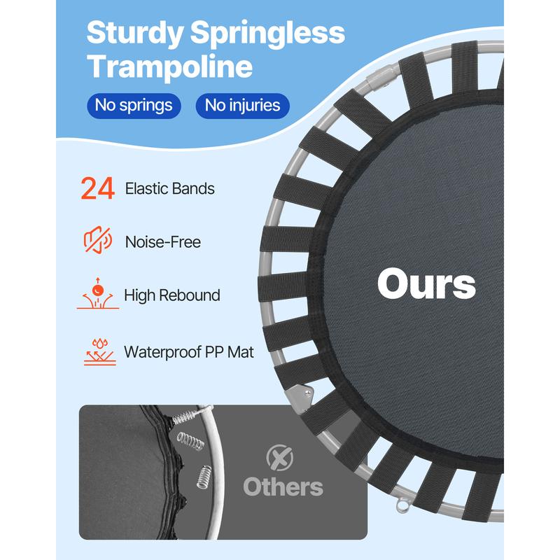 • Reinforced Legs: Constructed with a heavy-duty frame, PP jumping mat, safety pad covers, flat elastic bands, rubber-tipped leg tubes, and foam-covered handles, this mini baby toddler trampoline is built to last. The newly upgraded reinforced legs resist bending and deformation, ensuring solid stability. The rubber foot pads provide silent bouncing.