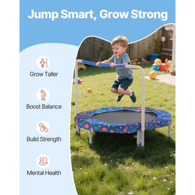 • Quick Storage with Foldable Design: Featuring a foldable frame design, our indoor outdoor toddler trampoline occupies only one-quarter of its original volume when folded, making storage easy and space-saving. It can be tucked away under a sofa or in the trunk of a car. The foldable design also makes it easy to move, allowing kids to jump wherever they like.