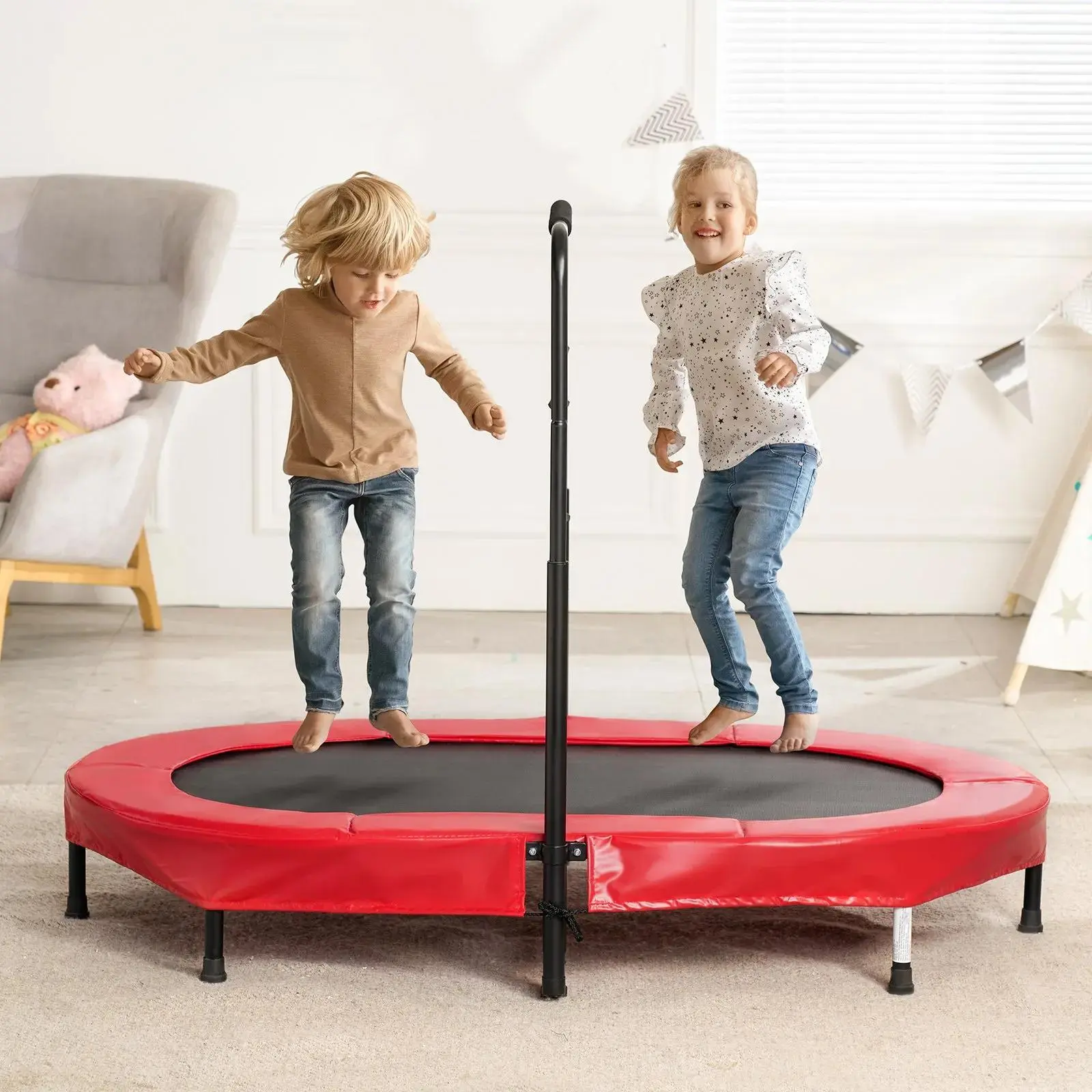 The trampoline is a rebounder trampoline, perfect for toddlers. It encourages physical activity and fun. The red color adds a vibrant touch to any room. Kids will love the handle for added security. It's a great way to keep children active and entertained.