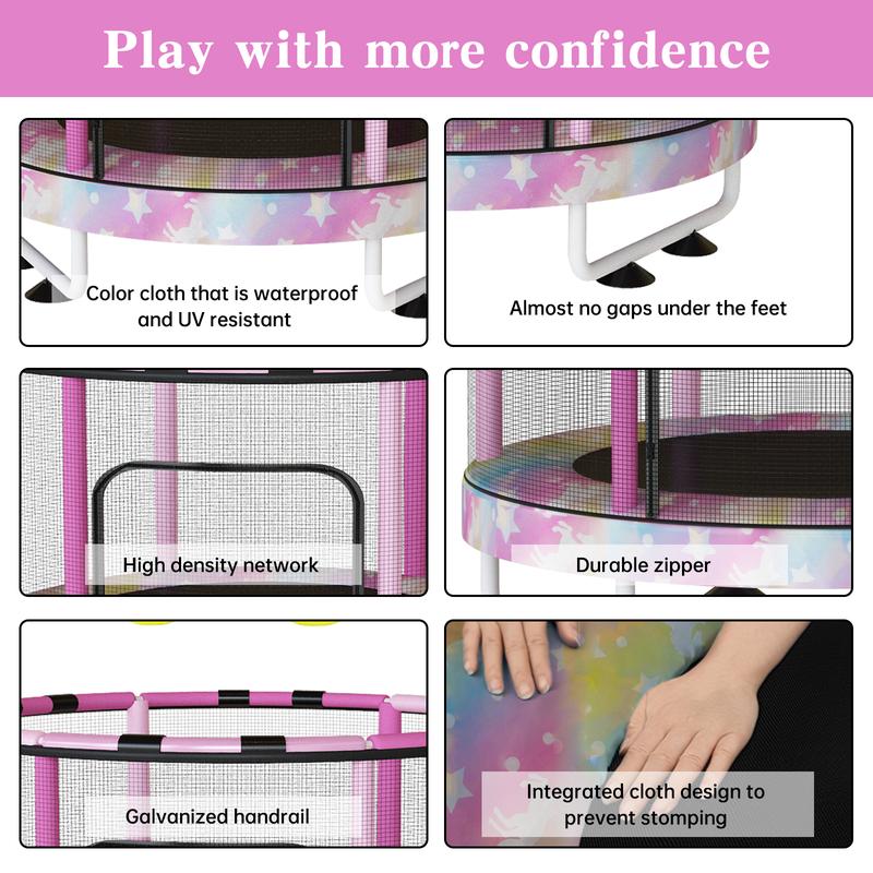 ·Bright Colors & Fun Design: Designed to captivate children's attention with vivid colors and attractive features.No-Stop Bouncing And Fun: Designed with 36 pieces reinforced springs, the anti-slip base pads can be firmly fixed and keep a strong stability when kids bouncing. Our Lamerge trampoline is designed for safety, durability, and enjoyment. Up to 500LBS capacity can covers all the kids need