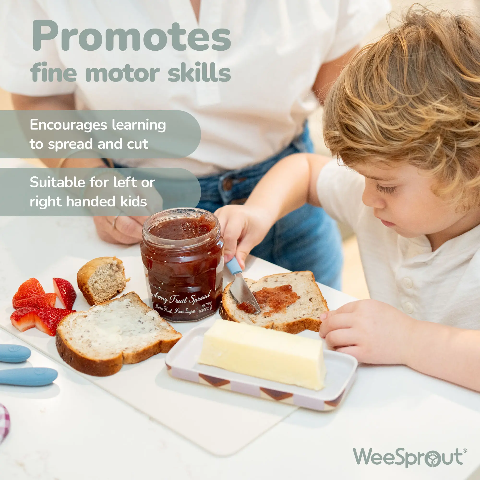 The ergonomic handles are crafted from food-grade silicone for a comfortable, easy grip, while the 18/8 stainless steel heads provide long-lasting performance through every growth stage. The rounded, child-safe knife is ideal for practicing safe spreading and beginner cutting skills.