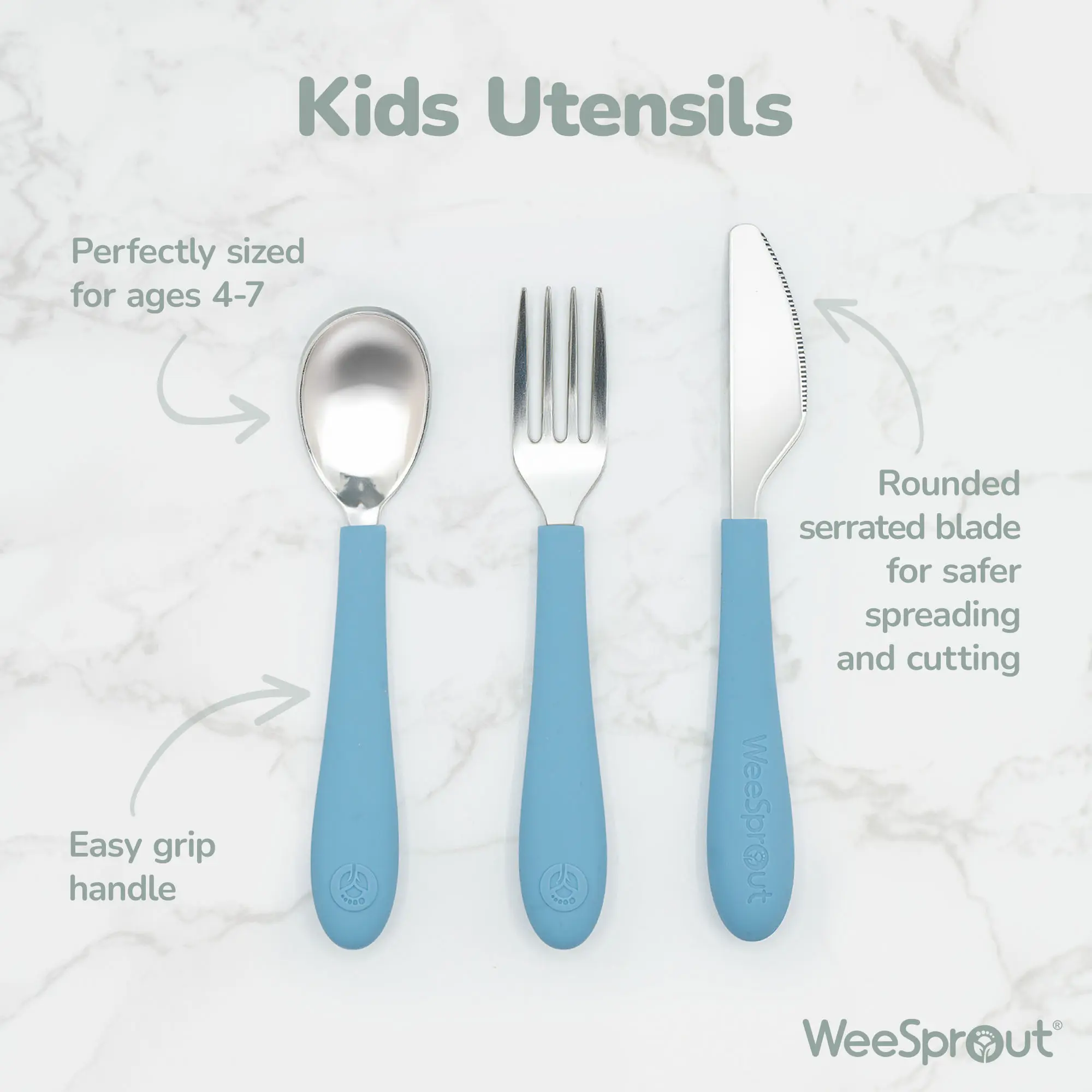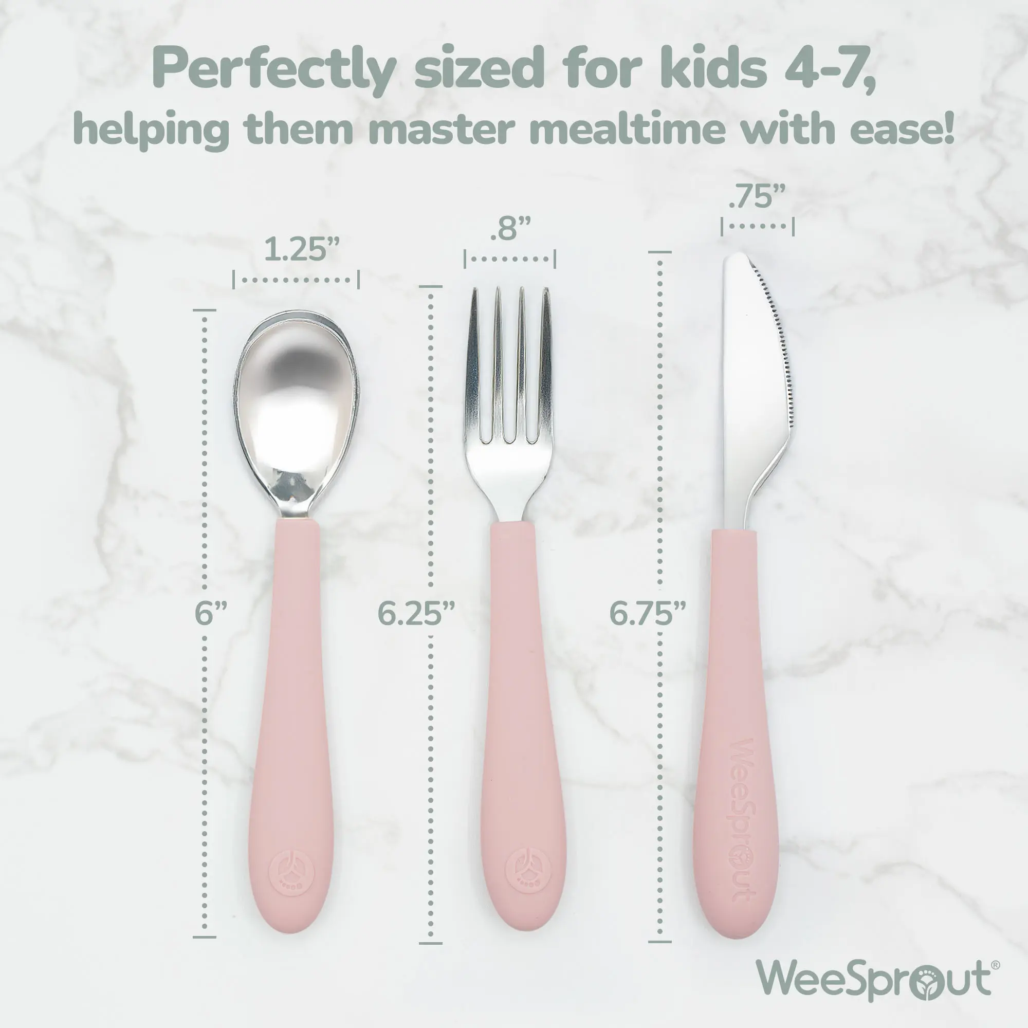 WeeSprout Kids Utensils are expertly designed to bridge the gap between toddler and adult flatware — helping kids master independent eating with confidence. Sized just right for children ages 4–7, each piece encourages proper grip, coordination, and table habits.