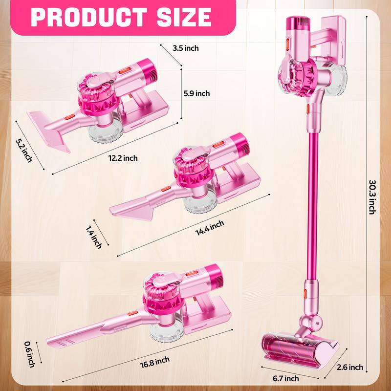 The set includes one vacuum body, four different cleaning heads, and an extension pipe. It offers two working modes (Auto and Manual). The BLAXTEM Household Pretend Play Vacuum Cleaner Set offers multiple cleaning options and is suitable for various household scenarios.