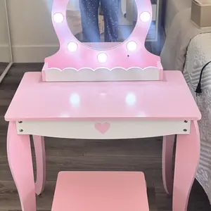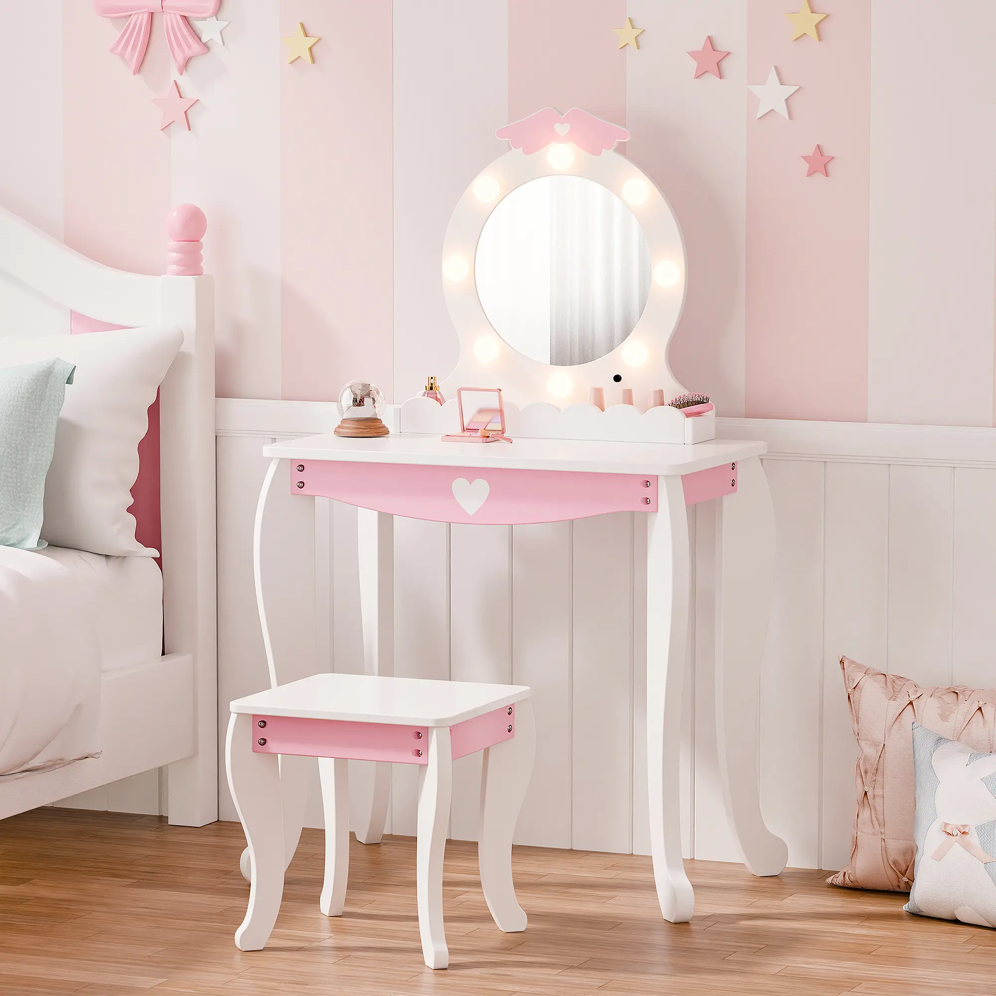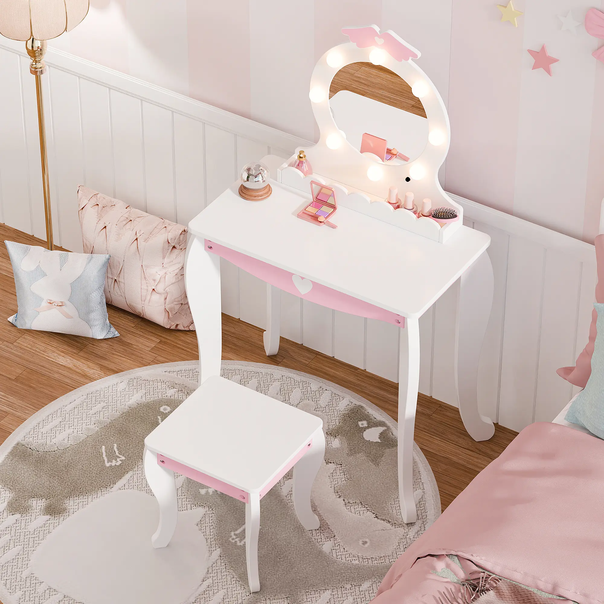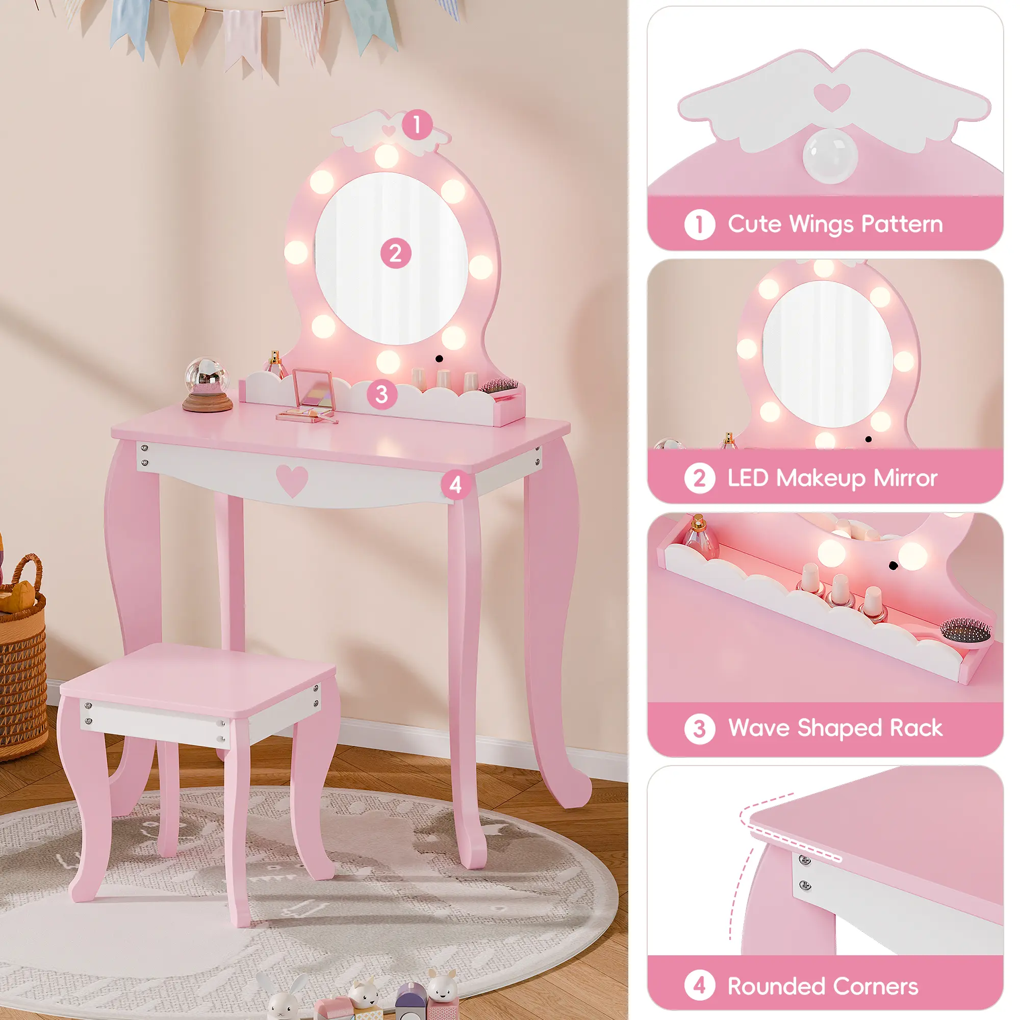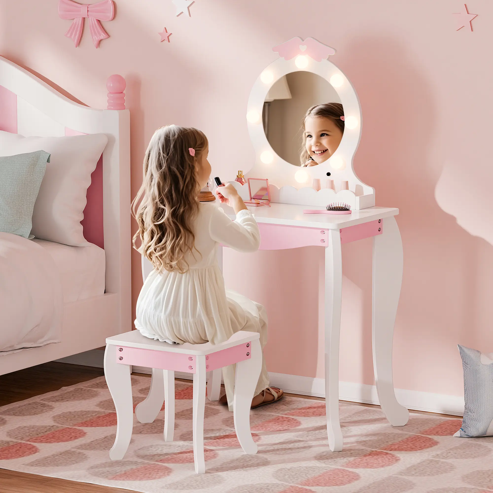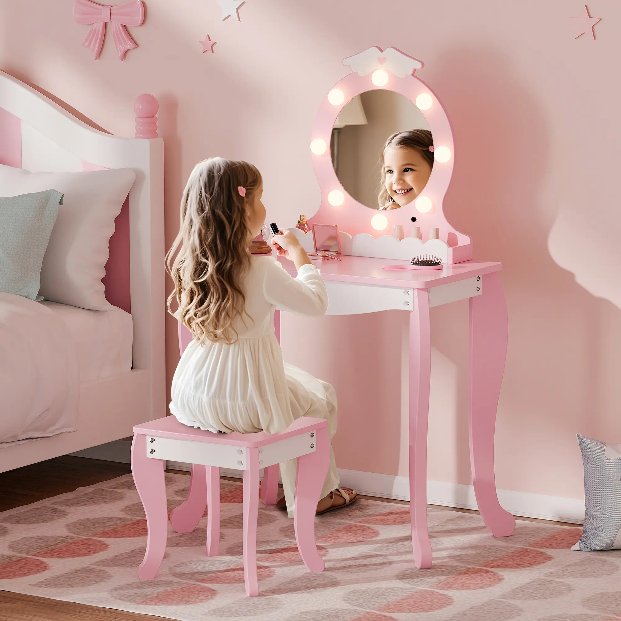 ·Safe & Sturdy Build – Built from durable engineered wood and solid legs, this girls vanity set with stool is designed to stay stable and strong. The smooth surface and rounded edges make it a safe choice for kids to use every day.