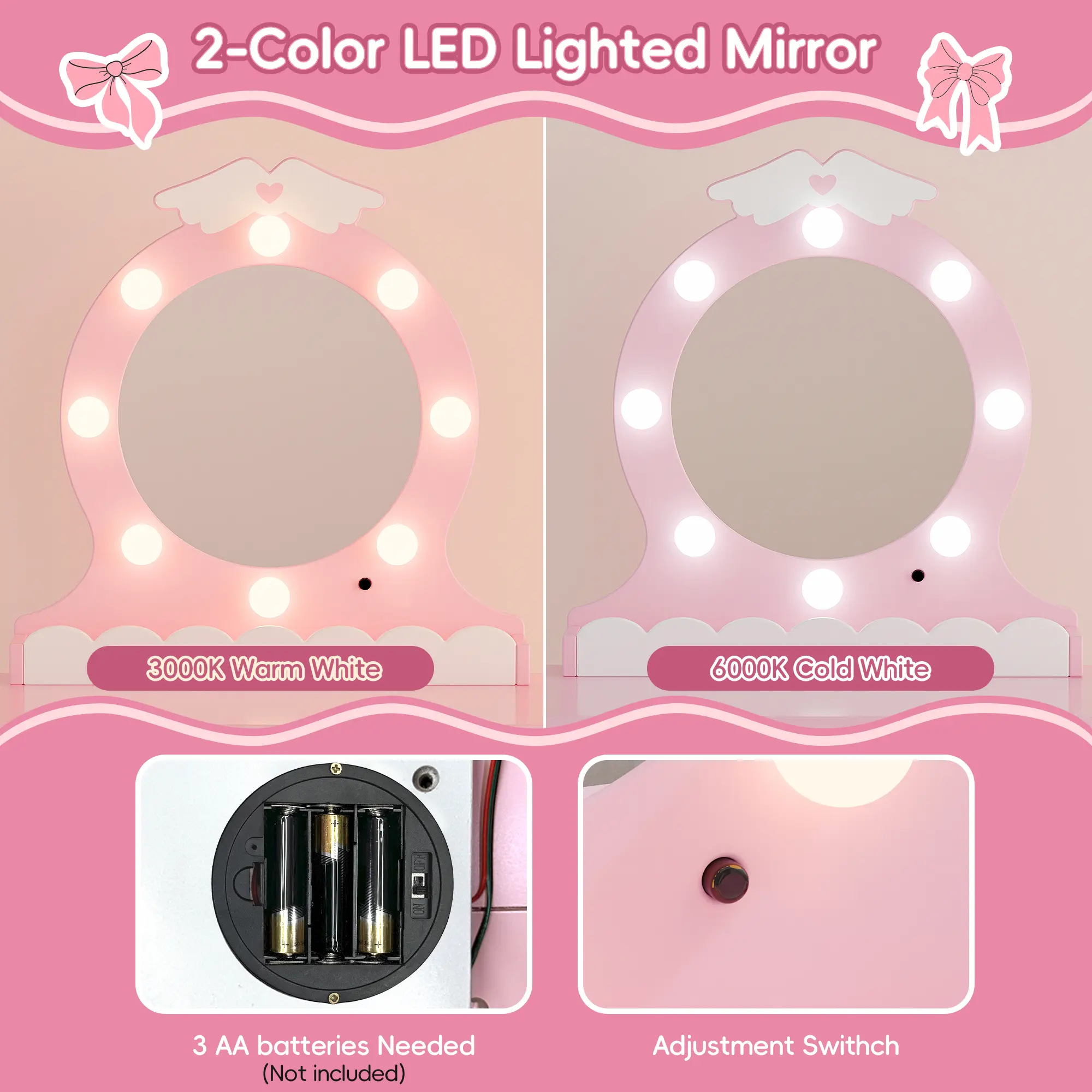 ·Kids Vanity with Lighted Mirror – This adorable kids vanity features a two-tone LED mirror (warm and cool light) with a clear reflection, perfect for checking makeup and hairstyles from every angle. When playtime is over, girls can neatly store their hair clips, headbands, nail polish, and more in the cloud-shaped drawer or on the spacious tabletop.