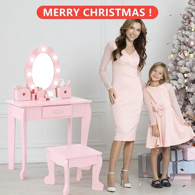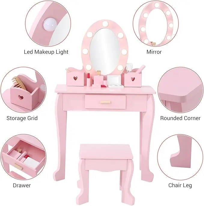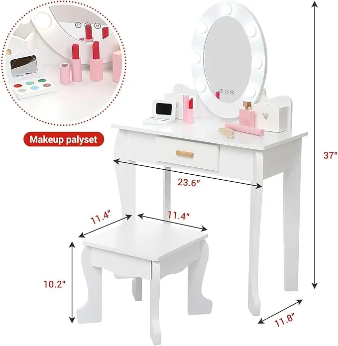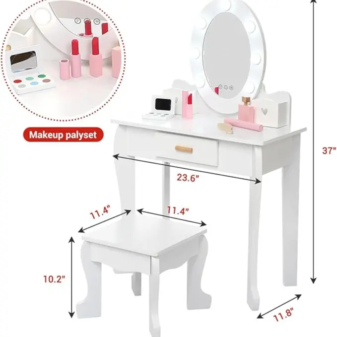 ·Our vanity desk will come to your girls, including a vanity , a stool and a wood makeup play set for endless fun. It allows children to experiment with different looks and have their own space and tools for grooming can promote a sense of independence and responsibility for their personal care routines.