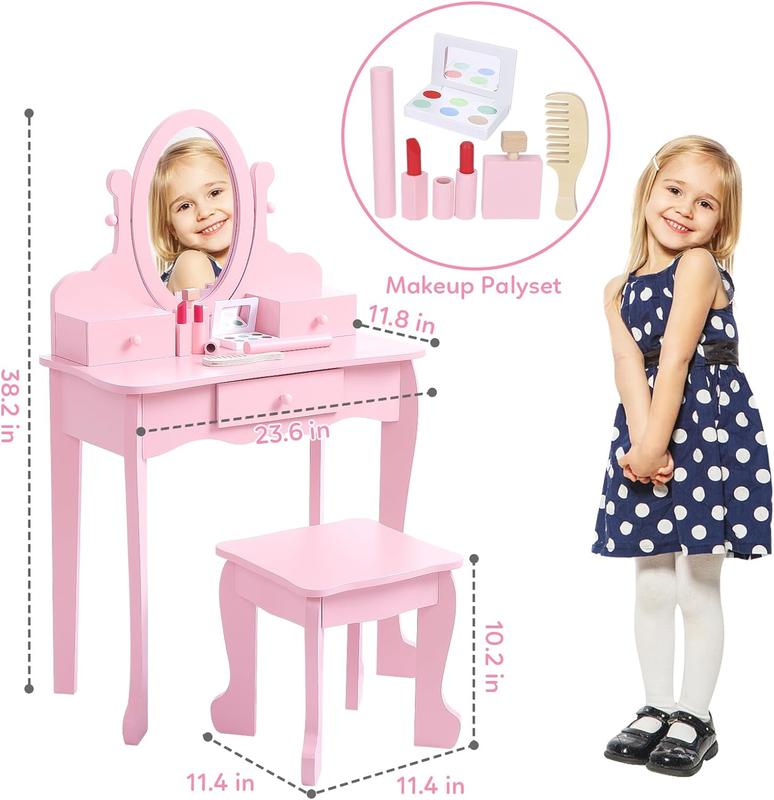 Our vanity desk will come to your girls, including a vanity with adjustable angle mirror , a stool and a wood makeup play set for endless fun. It allows children to experiment with different looks and have their own space and tools for grooming can promote