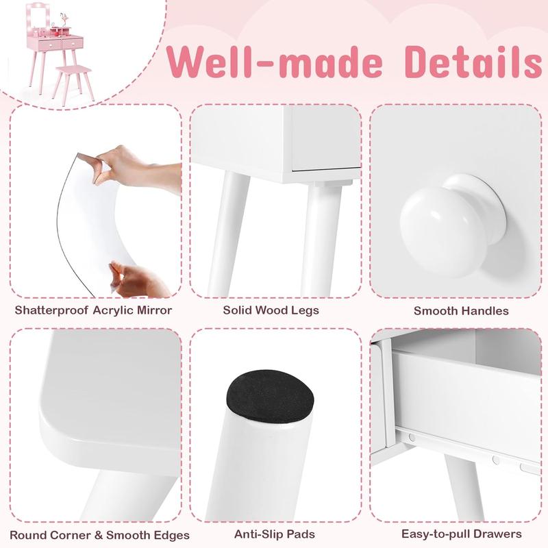 ·Certified Safe Construction: Kids vanity table and chair set meets ASTM & CPSIA standards, featuring rounded corners, anti-slip pads, and smooth MDF finish for complete toddler safety