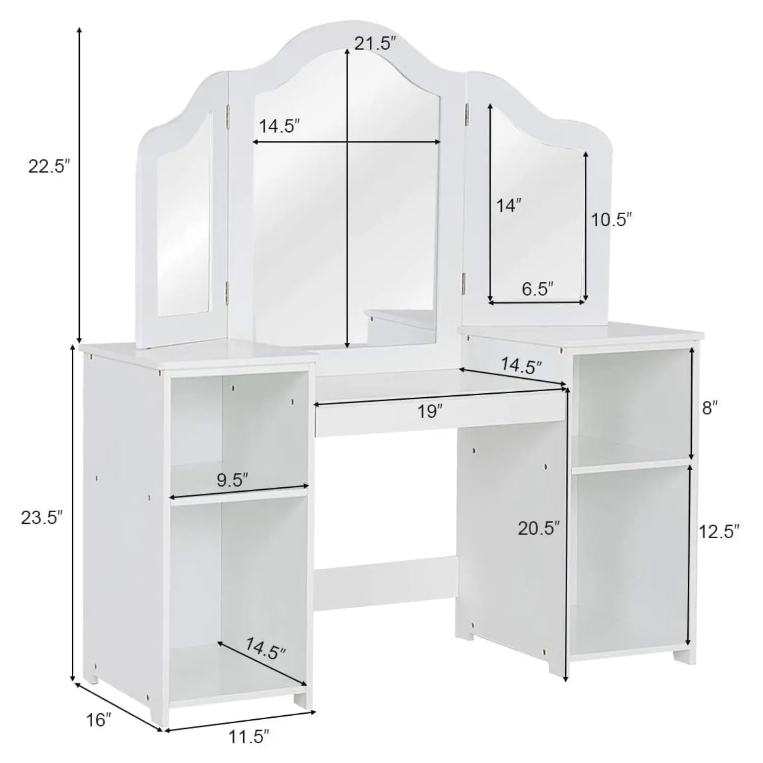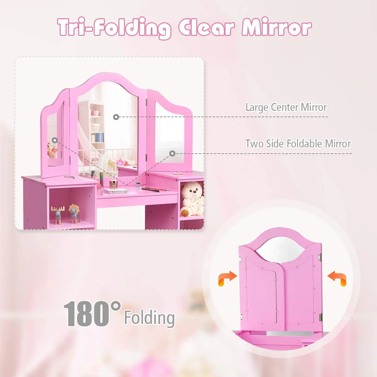 ·【Detachable Tri-folding Mirror】: The adjustable 3-panel mirror provides a larger vision of dressing up, allowing your little princess to observe her makeup, hairstyle and outfits in all directions. It is worth mentioning that the top mirror can be removed as needed, making this vanity table easily turn into a children's writing desk.