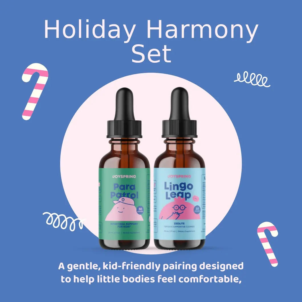 The Holiday Harmony Set brings together two of our most-loved formulas — ParaPatrol and LingoLeap B9 — to support kids’ natural digestive comfort and daily cognitive well-being when routines shift, schedules get wild, and holiday excitement is at an all-time high.
