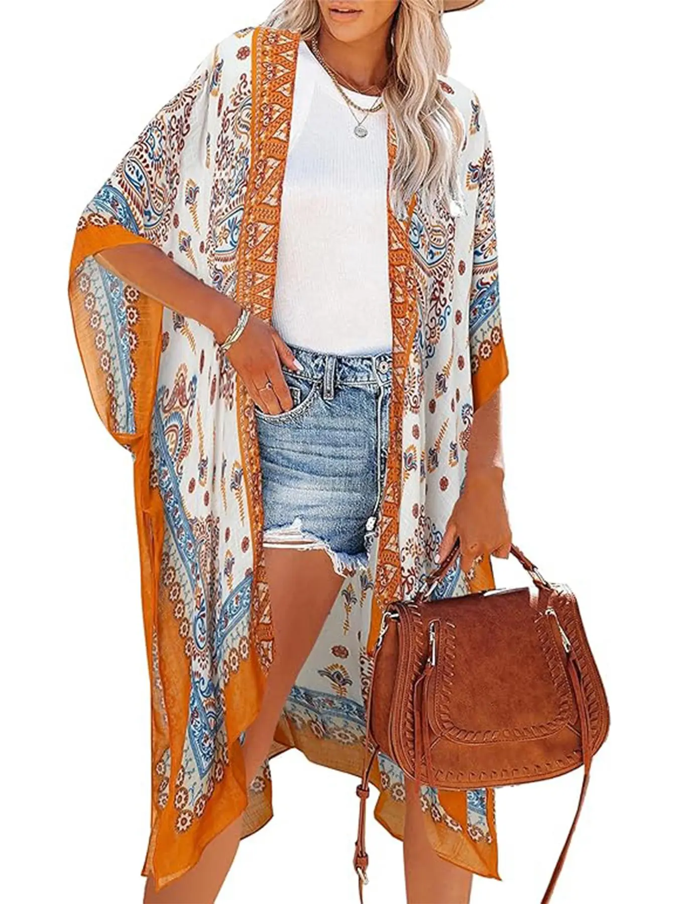 I wear this kimono wrap round. It is perfect in the spring and summer over a pair of denim shorts, but I also layer it with sweat, sweaters, and cardigans in the spring and summer.