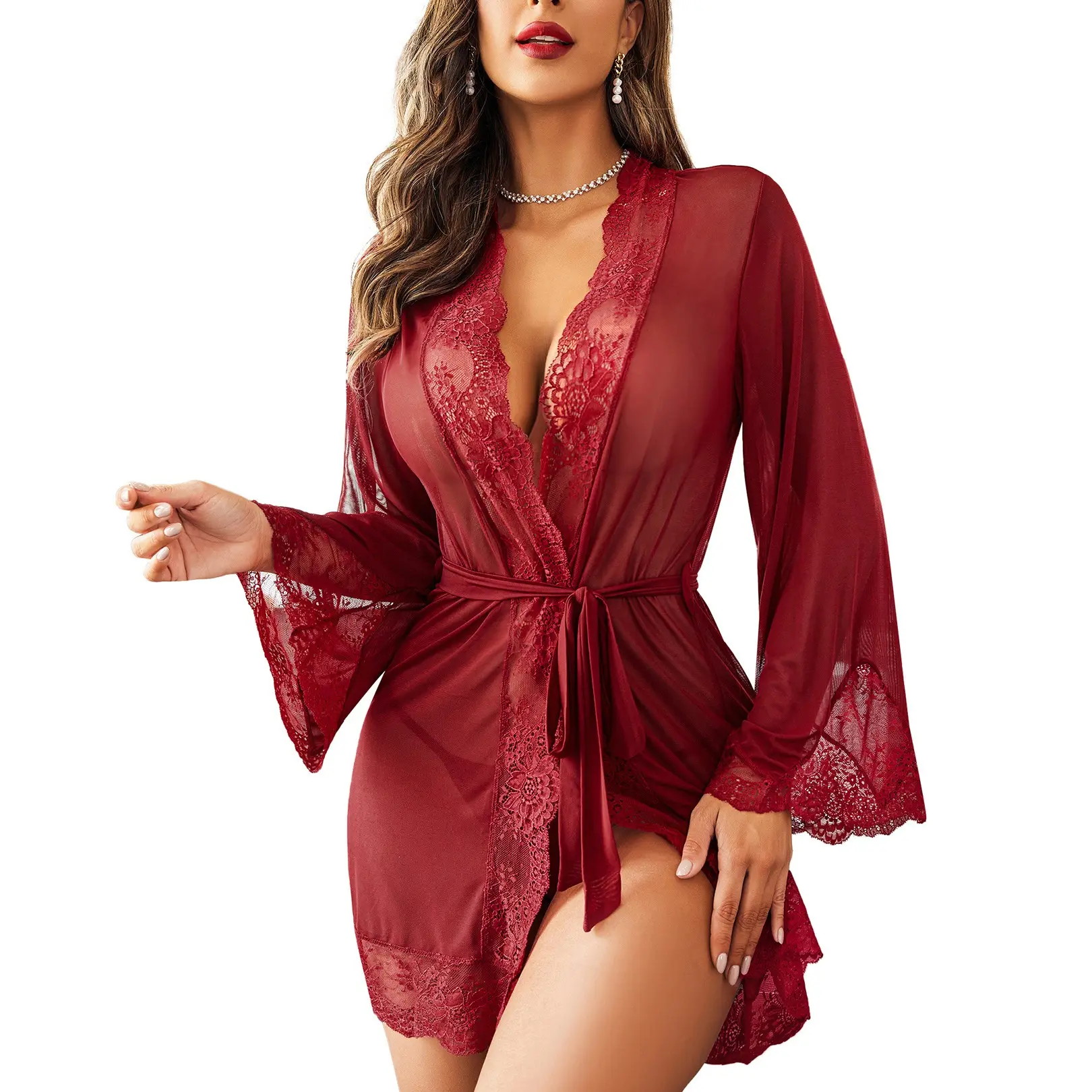 ·This lace robe features beautiful lace detail, deep v neck, scalloped lace edge trim, cute mesh belted waist and mini length, completely shows off your curve