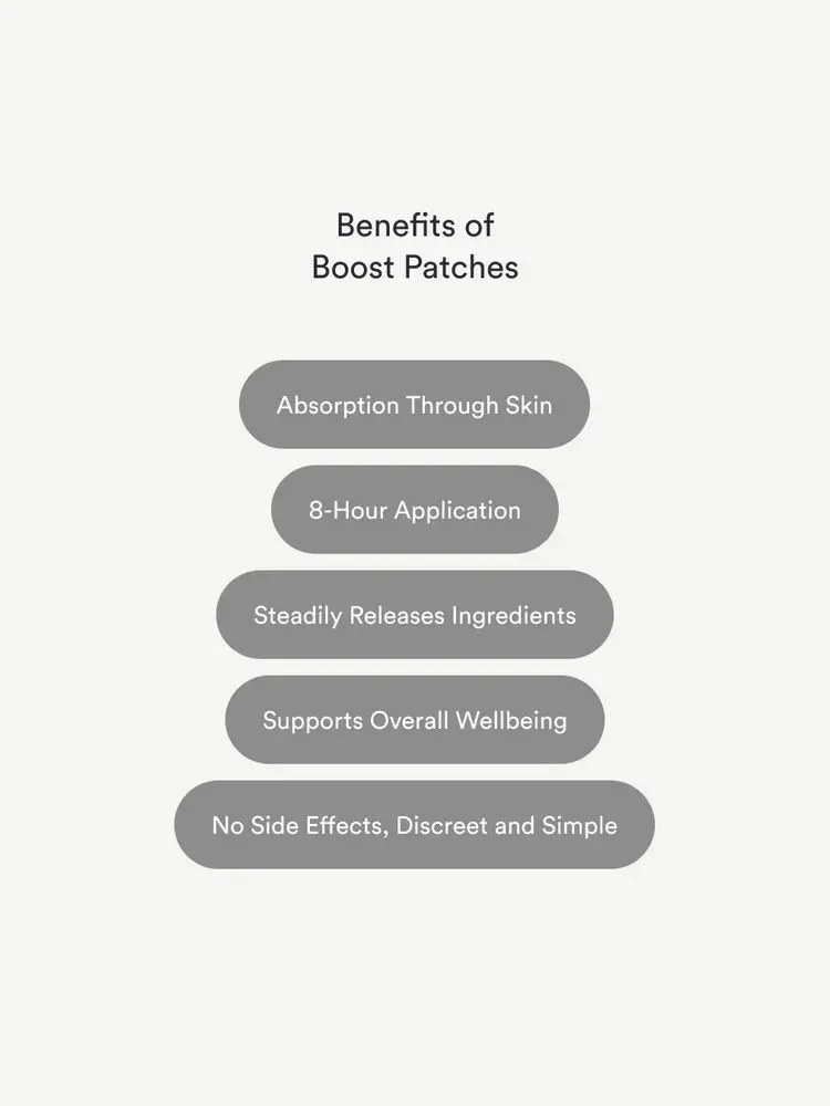 Boost Patches are formulated to support daily energy, immunity, and overall vitality. Packed with essential nutrients like Vitamin B Complex, Zinc Picolinate, and Magnesium Bisglycinate, they help keep you energised, resilient, and balanced—day after day.