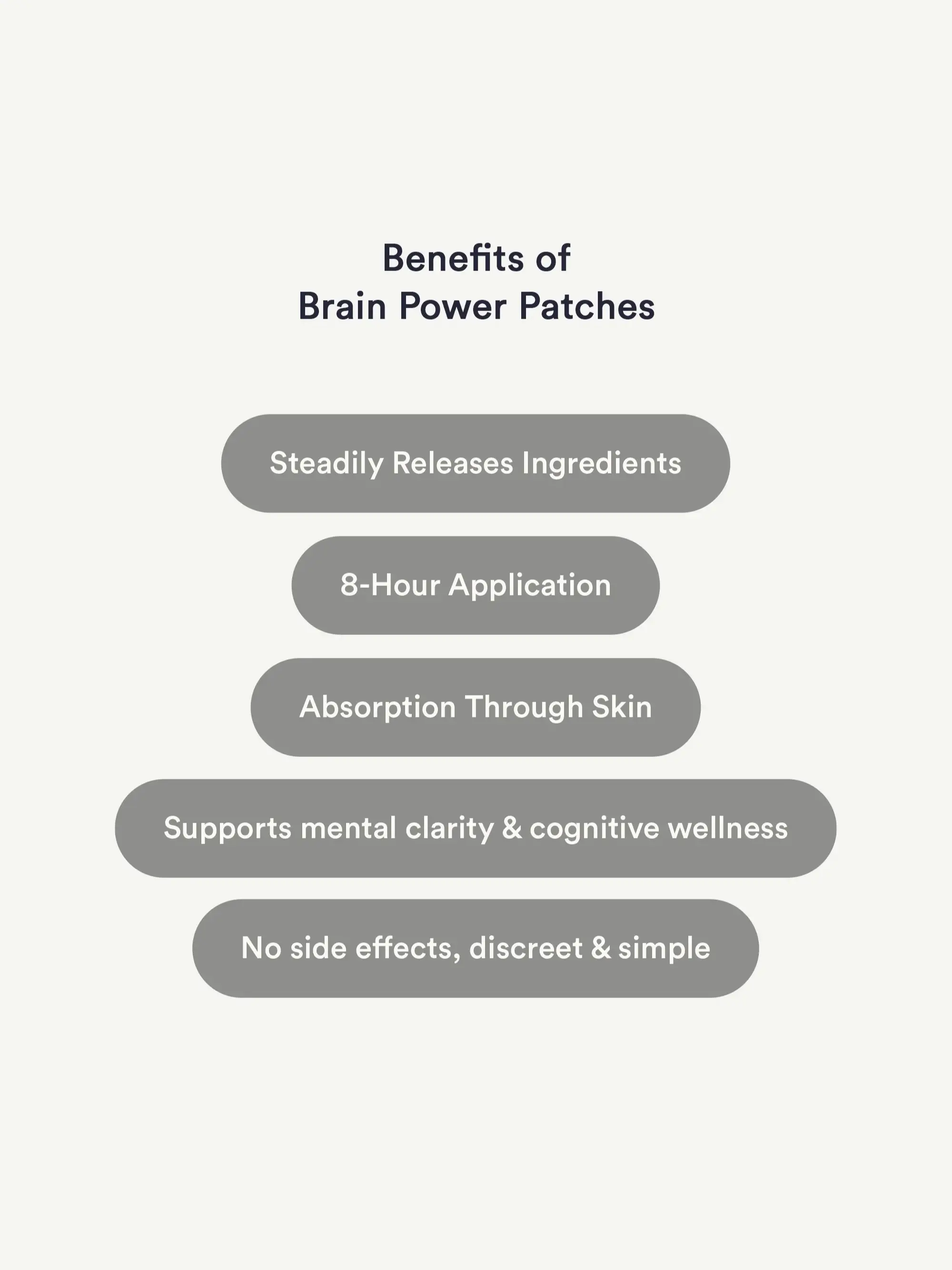 Brainpower Patches: Our Brainpower Patches are formulated with a thoughtful blend of traditional botanicals and functional nutrients, carefully selected for their role in supporting long-term cognitive wellness. These vegan-friendly, stimulant-free patches are designed to complement your daily rhythm.