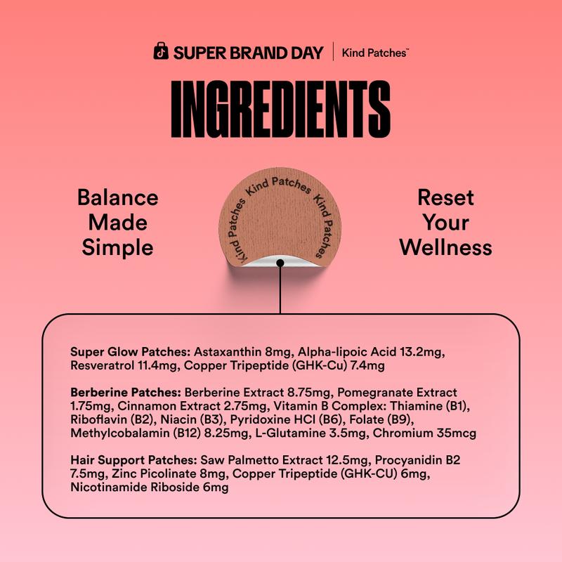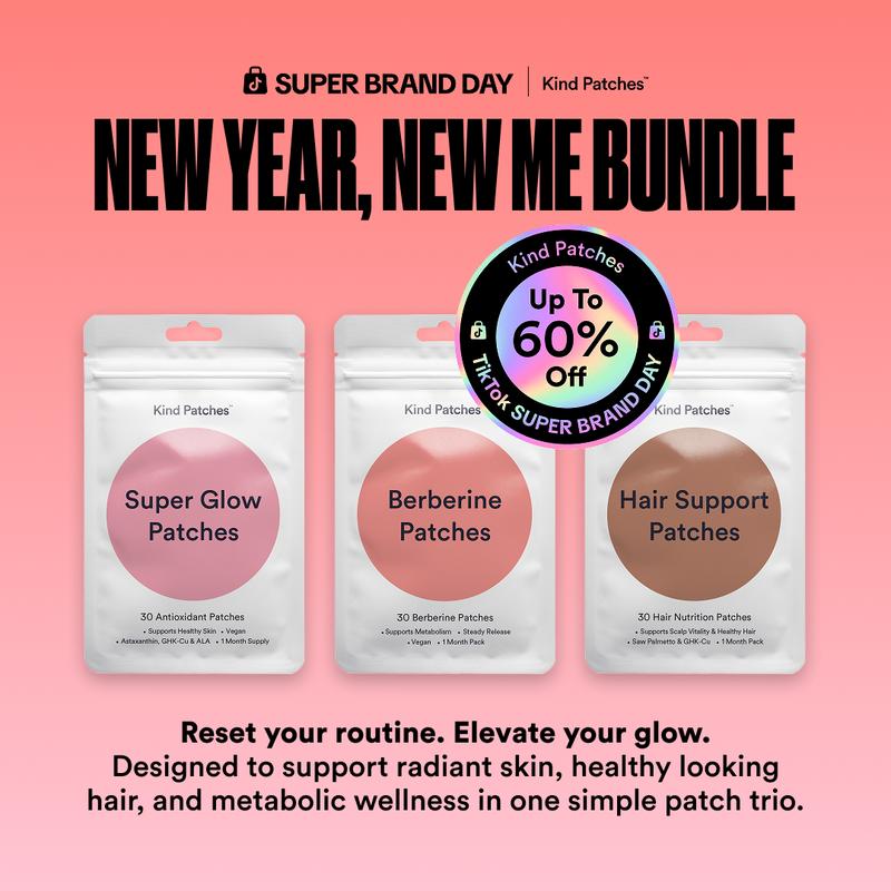 New Year New Me Bundle combines Super Glow Patches for luminous, smooth skin, Berberine Patches for metabolic balance and Hair Support Patches to strengthen and nourish from the roots.