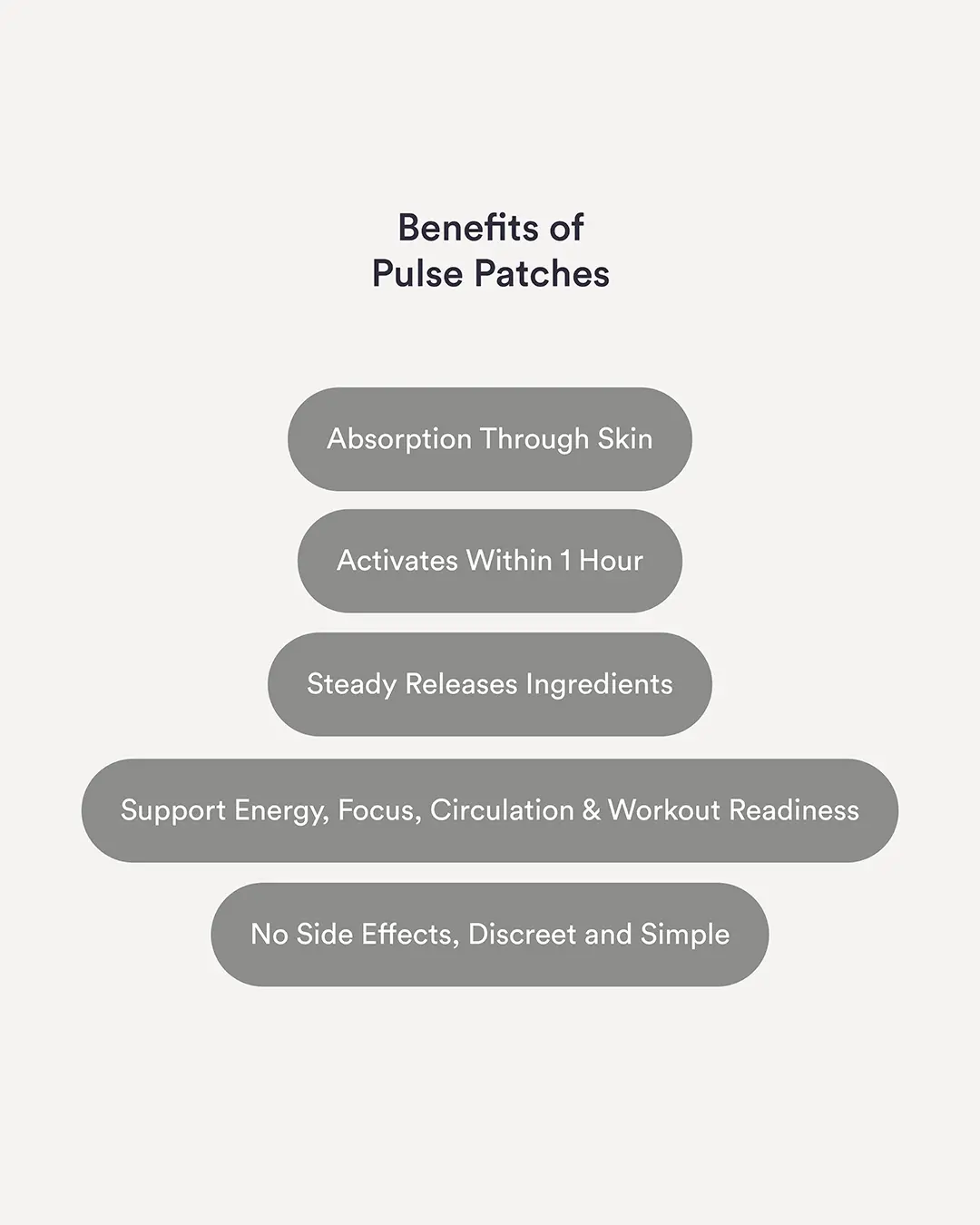 Pulse Patches: Pulse is a daily performance patch you apply 60â90 minutes before movement to support energy and focus.This patches is designed to help you feel ready to move without powders, crashes, or digestive discomfort.