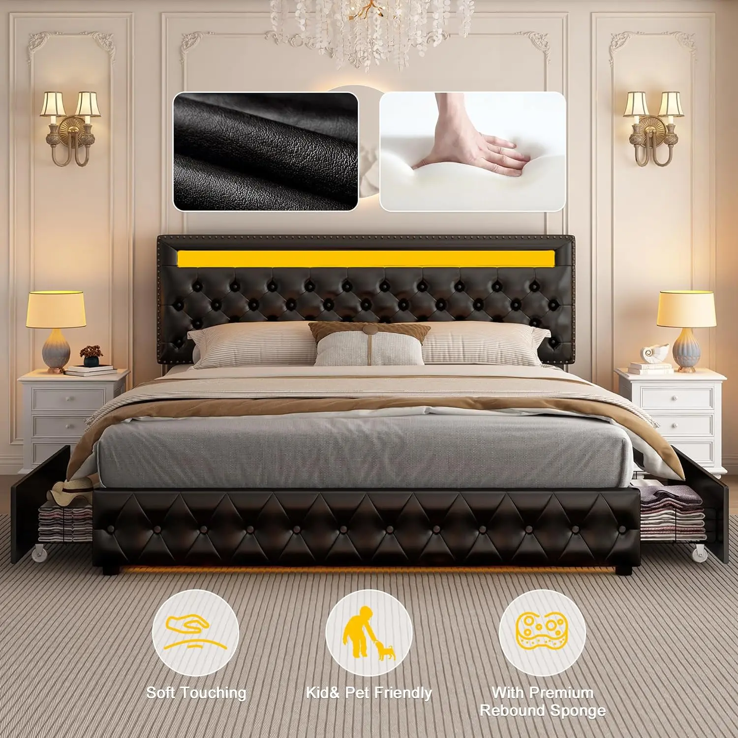 GEGOFORU Queen LED storage bed frame features 4 spacious under-bed drawers with smooth-rolling wheels, perfect for storing clothes, bedding, or daily essentials. A smart solution for keeping bedrooms neat while maximizing storage space.