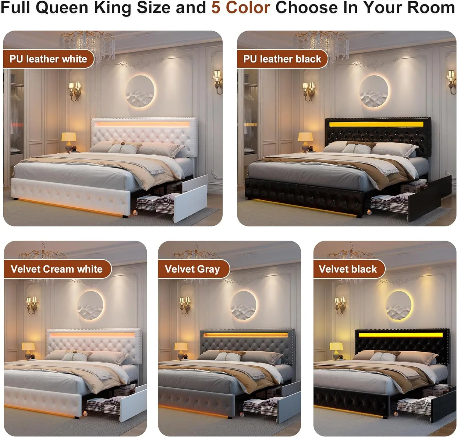 Available in PU Black, PU White, Velvet Beige, Velvet Black, and Velvet Gray (Off-White tone). Choose PU for easy cleaning and durability, or velvet for a softer, cozier feel.