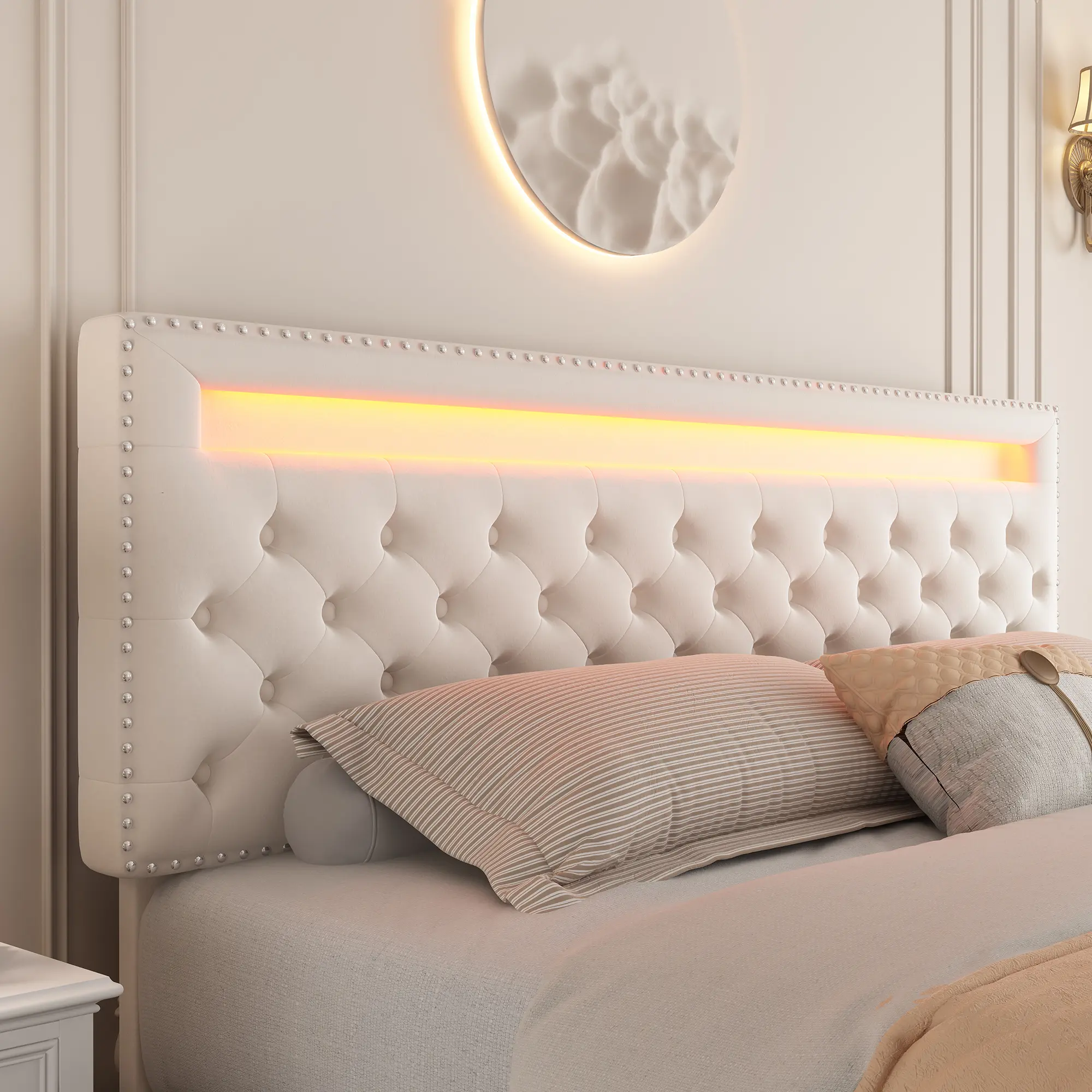 Upholstered in PU leather or velvet fabric, this LED bed frame blends modern style with comfort. The button-tufted headboard with silver nailhead trim adds a refined, luxury touch—perfect for contemporary, minimalist, or upscale bedrooms.