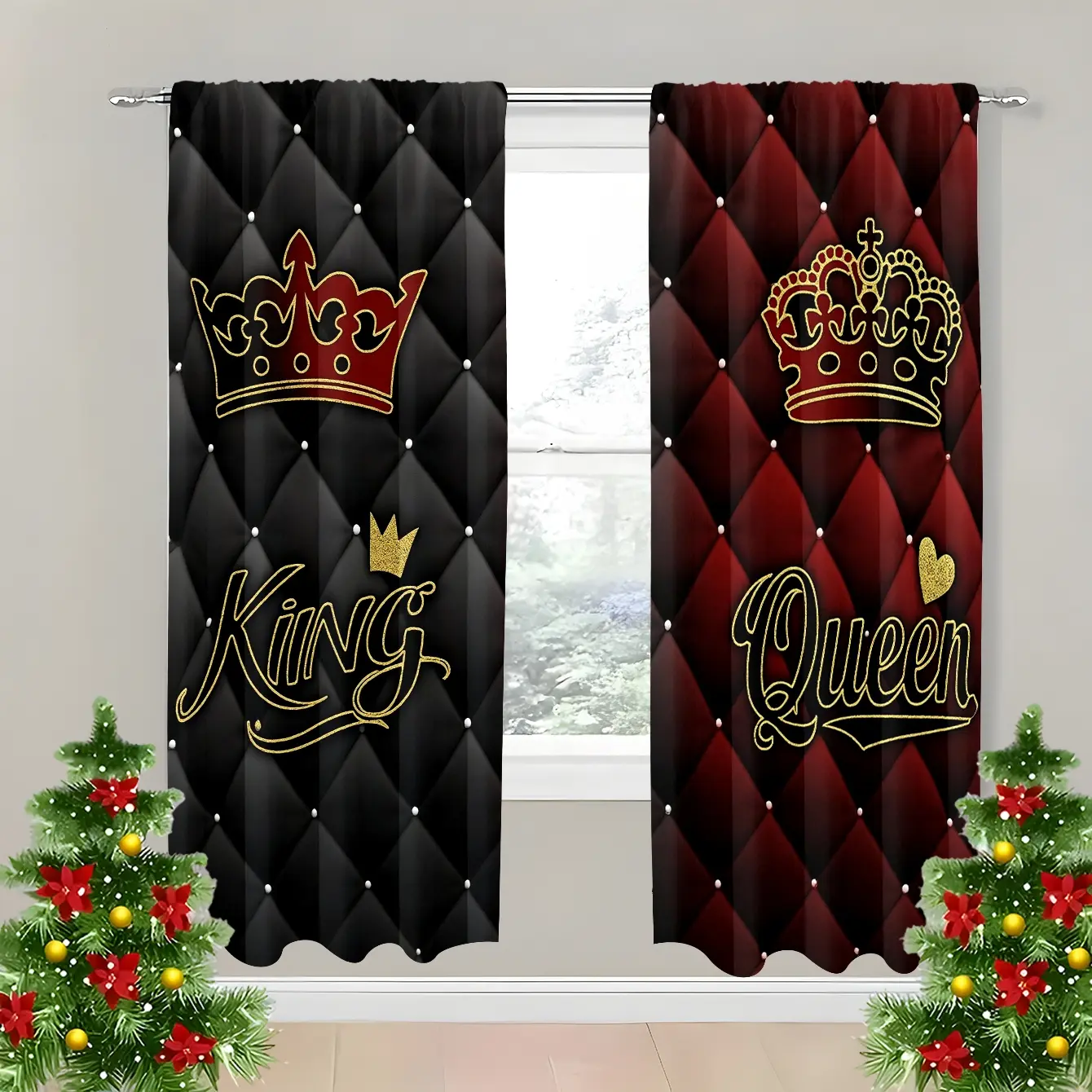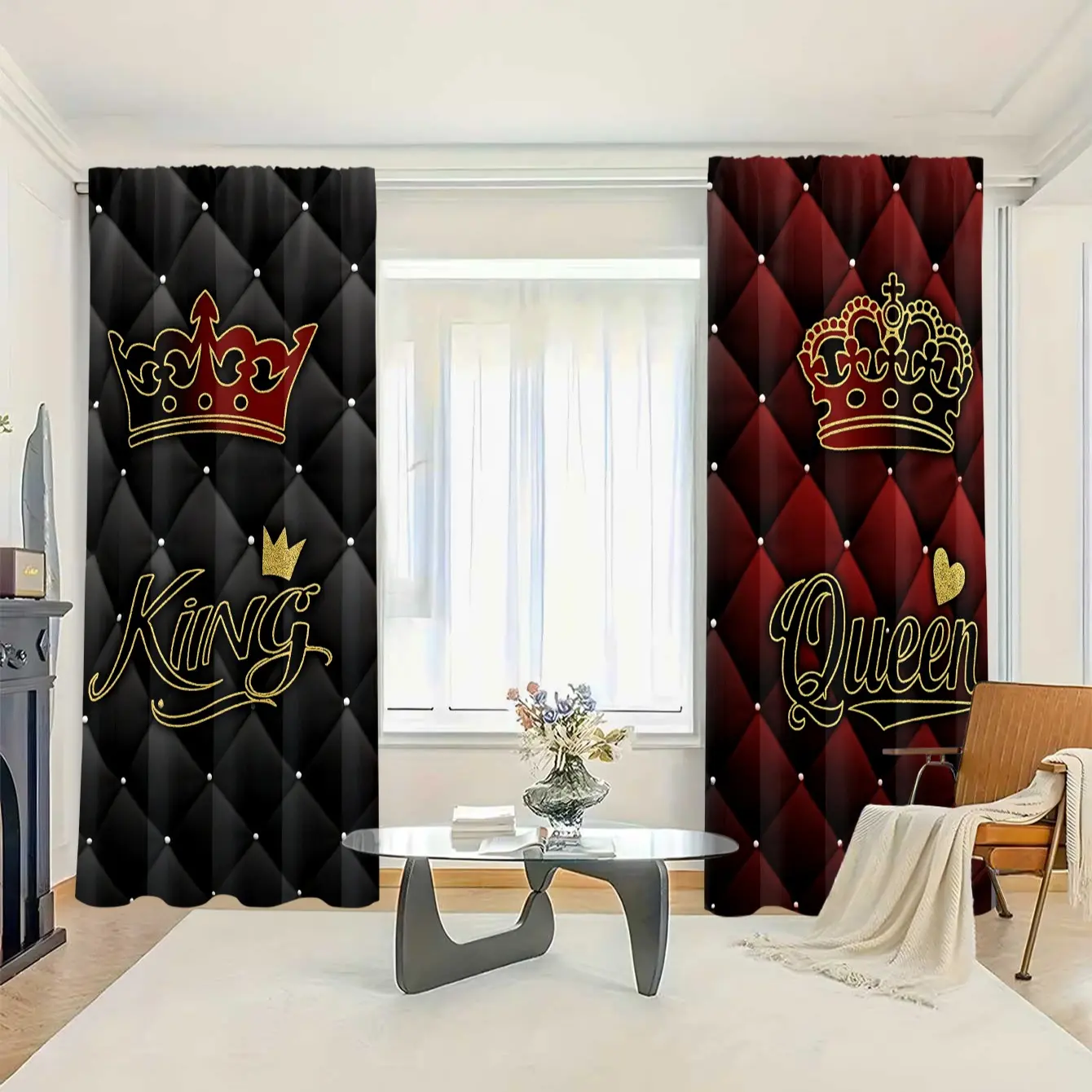King & Queen Crown Pattern Curtains Set, Polyester Fiber Material, Light Luxury Palace Style, Rod Pocket Design, Suitable for Bedroom Living Room Decor, Window Curtain, Home Decoration Curtain