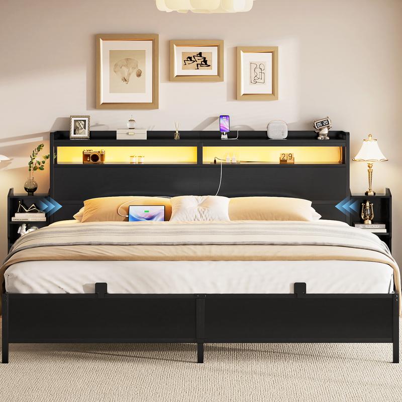 ·King Size Bed with Charging Station: The king bed frame features 3 AC outlets and 2 USB ports, offering charging for your tablet, phone, or other gadgets. The bed frame with a charging station can keep your devices fully charged state and within easy reach.