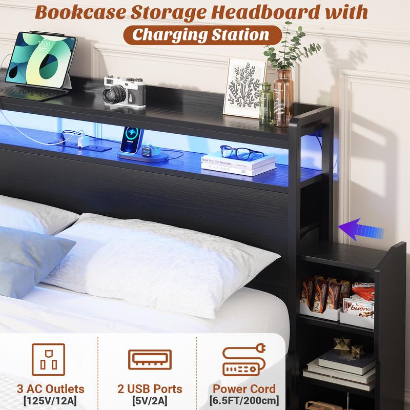 ·Headboard with Bookcase Storage and Two Slide Cabinet: The 2-tier open storage shelf on the headboard, provides ample space for commonly used items like books, phones, and other easy-get things. On each side, have 3-tier storage side nightstand that can be effortlessly pulled out, perfect for private items. With 12.6" under-bed clearance, it meets your daily storage needs and sweeping robots can also clean easily.