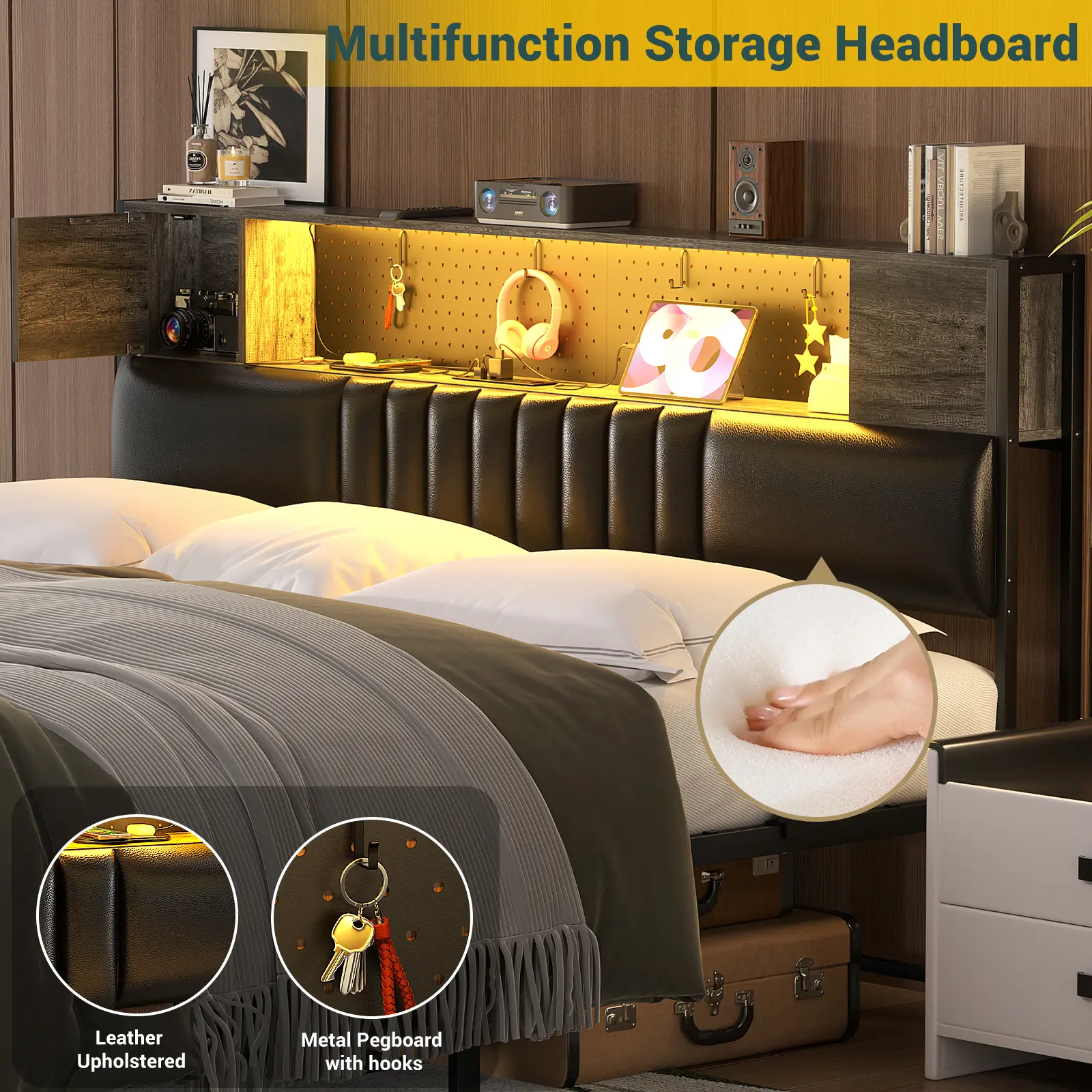 ·Thoughtful Headboard with Storage Cabinet -Our well-designed headboard of the upholstered bed frame features a thoughtful design with large open storage shelves and two private storage cabinets with doors, allowing for easy organization of your phone, books, decorations, or some odds. Our storage headboard is equipped with a metal pegboard to catch any magnetic decorations, as well as includes four hooks to hang headphones or others you like.